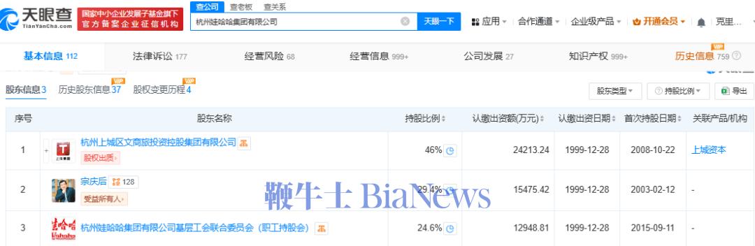 天眼查显示,杭州娃哈哈集团有限公司有三大股东。其中,杭州上城区文商旅投资控股集团有限公司(以下简称“杭州上城文商旅集团”)为其第一大股东,持股46%。杭州上城文商旅集团由杭州上城区国有资本运营集团有限公司100%控股。