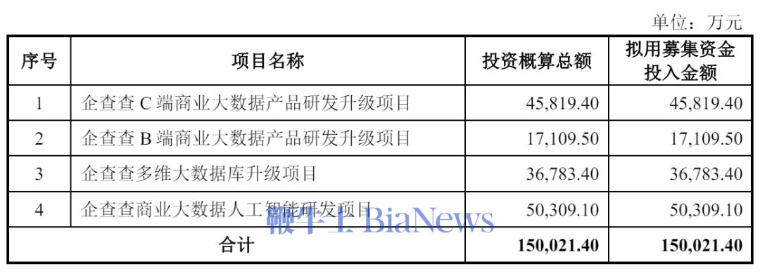 企查查计划募资15亿元,其中,4.58亿元用于企查查C端商业大数据产品研发升级项目,1.71亿元用于B端商业大数据产品研发升级项目,3.68亿元用于多维大数据库升级项目,5亿元用于商业大数据人工智能研发项目。