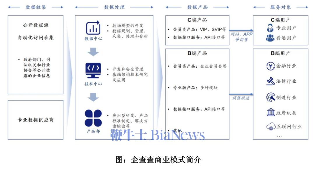企查查以各地各级政府部门、司法机关、行业协会等依法公示的公开信息为主要基础原料,对海量互联网数据源的商业大数据进行收集、清洗、标注、挖掘和分析,利用人工智能、大数据挖掘、可视化分析等技术手段进行深度的结构化、标签化处理,将有关联关系的离散数据建立联系,并基于对用户应用场景的理解,形成主要面向个人用户的会员类产品,和主要面向企业级用户的企查查专业版、数据接口服务等产品或服务。