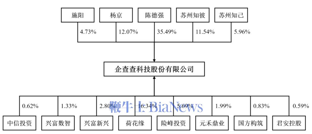 IPO前,企查查控股股东、实际控制人陈德强直接持股为35.49%,通过苏州知彼间接控制11.54%股权,通过苏州知己间接持股为5.96%,合计控制公司53%股权。