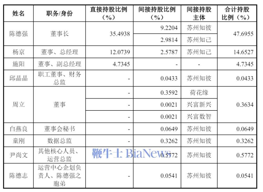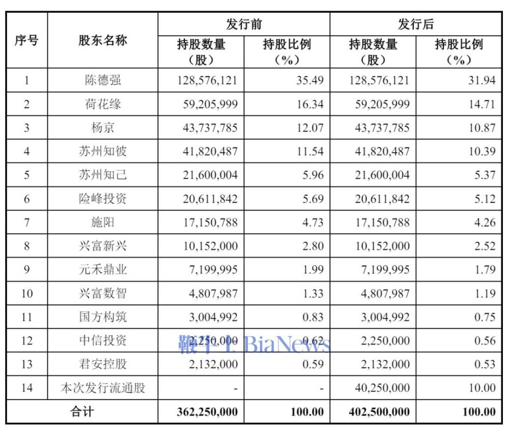 IPO后,陈德强直接持股为31.94%,荷花缘持股为14.71%,杨京持股为10.87%,苏州知彼持股为10.39%,苏州知己持股为5.37%,险峰投资持股为5.12%,施阳持股为4.26%,兴富新兴持股为2.52%;