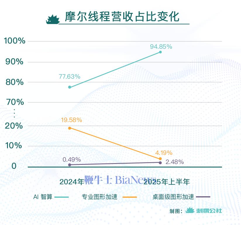 至于国产显卡,当时的选项基本上只有摩尔线程一家。不过很遗憾,即便摩尔线程专门就《黑神话》更新了驱动软件,但还是“卡”:在明暗表现、光线追踪、画面帧率上,其性能都不尽人意。 刺猬公社(ID:ciweigongshe)曾经尝试过用1000元组装一台能玩《黑神话悟空》的电脑,我们发现,四五百元的二手1060系列显卡,就可以流畅运行大部分3A游戏,价格仅为号称对标3060系列的摩尔线程S80显卡的四分之一。 尽管在一些方面,摩尔线程与英伟达尚不可同日而语,但作为国产GPU领域“全村的希望”,摩尔线程不仅仅是一家商业公司,也寄托着GPU自主可控的宏大目标。 在2025年国产替代的浪潮之下,摩尔线程也迎来了大爆发,2025年上半年营收7.02亿元,超过2022-2024三年之和。9月26日,摩尔线程通过科创板上市审议,以88天的“光速”过会,创下了科创板半导体企业的最快纪录。 摩尔线程的顺利上市,基本已成定局。但问题也随之而来:这家看起来最像英伟达的中国公司,将在AI浪潮、国产替代叠加的时代红利中,以何种方式追赶英伟达,继而从“形似”走向名副其实? 摩尔线程是最像英伟达的中国公司。其原因有三: 首先,翻开摩尔线程的高管名单,可以发现,其“含英伟达量”颇高: 创始人、总经理、董事长张建中,曾任英伟达全球副总裁、中国区总经理;联合创始人周苑(女),长期担任英伟达市场生态高级总监;其他联创如张钰勃、王东,副总经理杨上山等,都曾长期在英伟达任职。 2020年成立以来,摩尔线程一直被看做中国最具英伟达基因的半导体创业公司。刚刚成立还没有拿出产品时,仅凭创始团队的背景,就被认定是GPU独角兽。 其次,在公司发展路径上,摩尔线程和英伟达都是从图形加速起步,再从AI大模型训练的需求中迎来业绩爆发。 在研发上,摩尔线程还算“争气”,2021年至2024年,每年更新迭代一次GPU架构,性能逐渐提升,名字还是非常中国风的“苏堤”“春晓”“曲院”“平湖”。其中,“苏堤”“春晓”主要用于图形加速,“曲院”“平湖”用在AI领域。 30多年前,英伟达刚刚创业时,也不会想到原本用来做图形加速的GPU,能够成为左右人工智能发展进程的基础设施。和英伟达类似,摩尔线程在创业初期,也试图在桌面图形加速领域靠低价与英伟达竞争——通俗地讲,就是把更便宜的显卡卖给有打游戏、做视频需求的硬件消费者。 2022年,摩尔线程71.44%的营收,都来自桌面级图形加速,其余全部来自专业图形加速;2023年,桌面级图形加速营收占比仍高达23.67%。 但是,和英伟达打价格战,并没有让市场买单。2022、2023年,摩尔线程在卖显卡上取得的收入,也不过2、3千万人民币的量级;相较于英伟达同类部门GeForce在中国区约30亿美元的收入,是一个可以忽略不计的数字。低价卖显卡还给摩尔线程带来了大幅亏损,2022年此业务毛利率为-70.08%。 AI大模型训练带来的算力需求大爆发,带飞了英伟达,也彻底改变了摩尔线程的营收结构。 若不是强劲的AI需求拉动,摩尔线程也不会取得从ToC到ToB的业务转型成果。2024年,摩尔线程的AI智算收入从无到有,占比跃升至77.63%,成为营收支柱,2025年上半年,更是高达94.85%。类似的,游戏相关业务还是英伟达在三四年前的主要营收来源,但目前AI计算收入已经占到英伟达收入的70%以上。 从显卡公司到AI算力基础设施公司,摩尔线程和英伟达走过了类似的路。其中也蕴含着摩尔线程和英伟达的第三个相似点: 除了AI计算业务,都有面向个人的消费级显卡业务。虽然这一业务对于摩尔线程而言,在2025年上半年营收占比只有不到1%了,但它仍然是我们几乎唯一可以买到的国产GPU。 技术,只是摩尔线程和英伟达最小的差距 既然是英伟达最好的中国学生,那么学生究竟有老师的几分本领,学生和老师之间的差距到底有多大呢? 先说技术。很遗憾,这已经是学生和老师最小的差距了。在设计层面,一般认为摩尔线程和英伟达的技术差距在一年至一年半左右,尽管摩尔线程已经每年迭代一次GPU架构紧紧追赶,但差距仍是客观存在的。 在制造工艺上,和英伟达一样,摩尔线程也采用业界通用的Fabless——无晶圆厂模式,只负责研发和设计,生产制造环节交给专门的晶圆厂代工。 但由于2023年底,摩尔线程被“卡脖子”列入实体清单,在供应链上的压力陡增。英伟达可以把GPU芯片制程升级到3纳米,但留给摩尔线程的选择只有5-7纳米。在芯片制造的技术突破之前,摩尔线程在工艺上的“追赶”基本无从谈起。 真正的差距在于,摩尔线程和英伟达生态之间的差距。英伟达之所以在AI计算领域拥有难以撼动的地位,很大程度上在于它基于CUDA架构,建立了一套高效的并行计算生态,让开发者能够便利地指挥GPU进行计算任务,当前主流的AI框架都依赖CUDA,是训练大语言模型的核心基础设施。 围绕CUDA,英伟达还建立了包括开发者社区、工具链等一整套生态体系。相比技术上的硬差距,生态系统上的差距更难追平。 作为英伟达的好学生,摩尔线程也建立了自己的CUDA——MUSA架构,并且努力兼容英伟达的CUDA架构。不过,由于时间尚短,缺乏足够多开发者的沉淀,MUSA的性能和稳定性距离CUDA还有一定差距。 技术、产品、生态上的全面差距,造成的结果就是摩尔线程在业绩上出现了一些令人担心的信号: 首先是扭亏时间遥遥无期。尽管相比2024年、2023年,摩尔线程在2025年上半年的亏损规模大幅度收窄,但最近三年,摩尔线