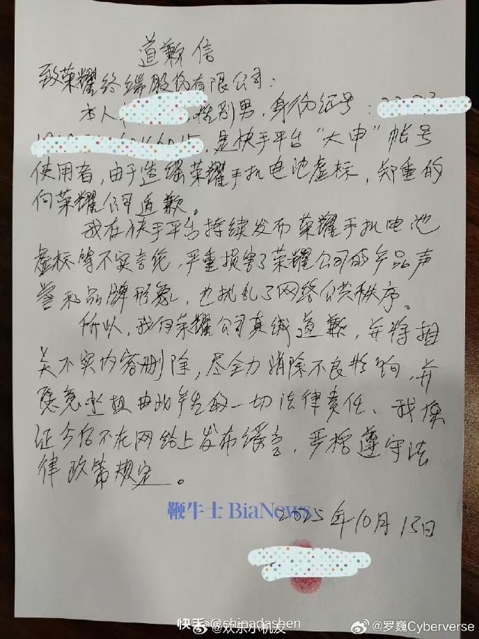 本人是快手平台“大申”账号使用者,由于造谣荣耀手机电池虚标,郑重地向荣耀公司道歉。