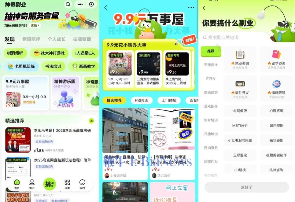 在购买人的时间和精力上,会玩儿的年轻人已经走得很远了。万物皆可售,有人租电动车跑外卖,有人掏钱买一天的单反相机使用权拍毕业照,更有“爱因斯坦的脑子”“发霉的酒精”等千奇百怪的卖品。在以搞钱为口号的年轻潮流青年的开发下,闲鱼逐渐从“物品交易”走向“服务经济”。不点开闲鱼副业板块,不知道世界上能花钱外包的服务有这么多。游戏陪玩、医院陪诊、cos委托等等以“陪伴”形式出现的线上线下服务属于常见内容,现在闲鱼的副业平台上细分程度已经非常高——初步分析,现在最常被人们使用的劳动工具是嘴,然后是耳朵,最后是脑子。1-10元的服务,主要集中在“动嘴皮子”的功夫上,这些在工作市场上难以量化和评估的“软”能力,在闲鱼上大放光彩。1块钱,你可以买一个人的嘴一分钟,让他在一天的早晚打电话提醒你起床、吃药或者背单词。4块钱,你可以买一个人的耳朵十分钟,心甘情愿当你骂人的出气筒,或者认真倾听你的原生家庭伤痛和恋爱困惑,疏解压力、分析婚姻、挽回前任是情感篇,除此之外,闲鱼的年轻人们在生活事业篇上也卷卷留名。10块钱,能买一个人的左脑(负责逻辑的那份脑子)一段时间,帮你做去贵阳玩的攻略。在闲鱼重生之我是小学生,有人代笔我写作文。回到大学时代,有人替我写论文。步入职场,花十块钱可以找人教我如何用AI应付领导。经过简略的肉眼测算,闲鱼副业板块卖的最好的还是咨询服务,大部分闲鱼交易集中在年轻化潮流化的兴趣爱好里,例如约同人头像的画稿,设计明星演唱会横幅等等。家具安装等费用较高、涉及大件的服务较少,帖子数量和购买者都不过百。另外,点进分类后,服务仍然以竖版帖子的形式呈现,无法依照首页搜索的逻辑进行排序,难以按照信用、销量等筛选到合适的服务,还是建议使用首页搜索栏。作为个人对个人的交易平台,信任关系基于“人”而非“品牌”。这种土壤上,非标准化服务容易生长。早在2020年,闲鱼已经出现技能买卖,2021年还有互联网博主开班教人如何在闲鱼上卖技能赚钱。2024年7月2日,闲鱼上线了“简历”功能,将技能变现需求单独划分为一项业务。根据《2024闲鱼副业产业带报告》,2024年,约945.4万卖家在闲鱼上发布技能类副业;这些活跃在闲鱼的年轻人,平均通过副业赚了3660.5元。在淘宝、京东、美团等平台上也有人开店推出虚拟的技能类服务。但闲鱼平台上的商品和服务价格可以由买卖双方自行协商决定,具有比较大的弹性。服务是什么不那么重要,闲鱼更在乎“有人想卖,有人想买”。