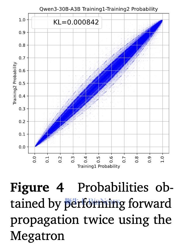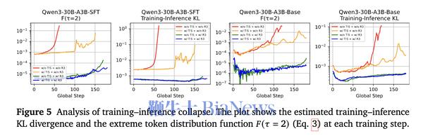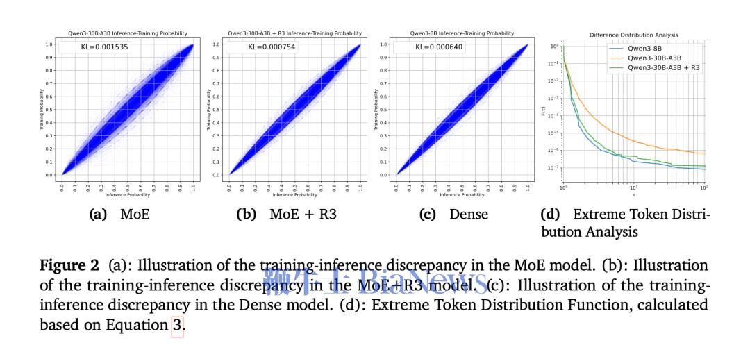 ▲a、MoE模型中训练-推理差异的说明,b、MoE+R3模型中训练-推理差异的说明,c、稠密模型中训练-推理差异的说明,d、极端token分布函数