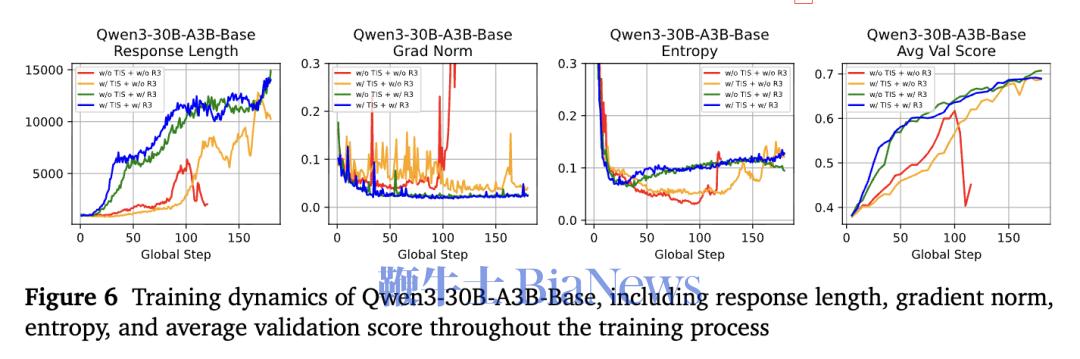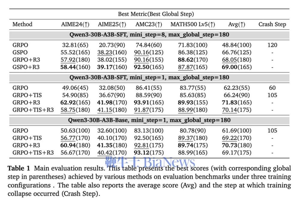 为了评估R3对强化学习的性能改进,研究人员从BigMath、ORZ等开源数据集筛选约10万道可验证数学题,采用AIME24、AIME25、AMC23和MATH500作为基准数据集进行评估,并在单次训练过程中每5个全局步骤测量一次模型性能。 其选择的模型是Qwen3-30B-A3B-Base及其微调模型Qwen3-30B-A3B-SFT。 评估方式是每5个全局步骤记录模型性能,最终报告最佳性能及对应训练步骤,若模型后期性能骤降,同时追踪训练崩盘步骤”。 实验结果表明,整体性能上,R3在多步更新场景,GRPO+R3平均得分68.05分,比GSPO高出1.29分;GSPO+R3进一步提升至69.00,比单独GSPO高2.24分。 单步更新场景,SFT模型上,GRPO+R3平均得分71.83分,比GRPO(62.23)高9.6分,比GRPO+TIS(66.24)高5.59分;Base模型上,GRPO+R3平均得分70.73,比GRPO(61.69)高9.04分。
