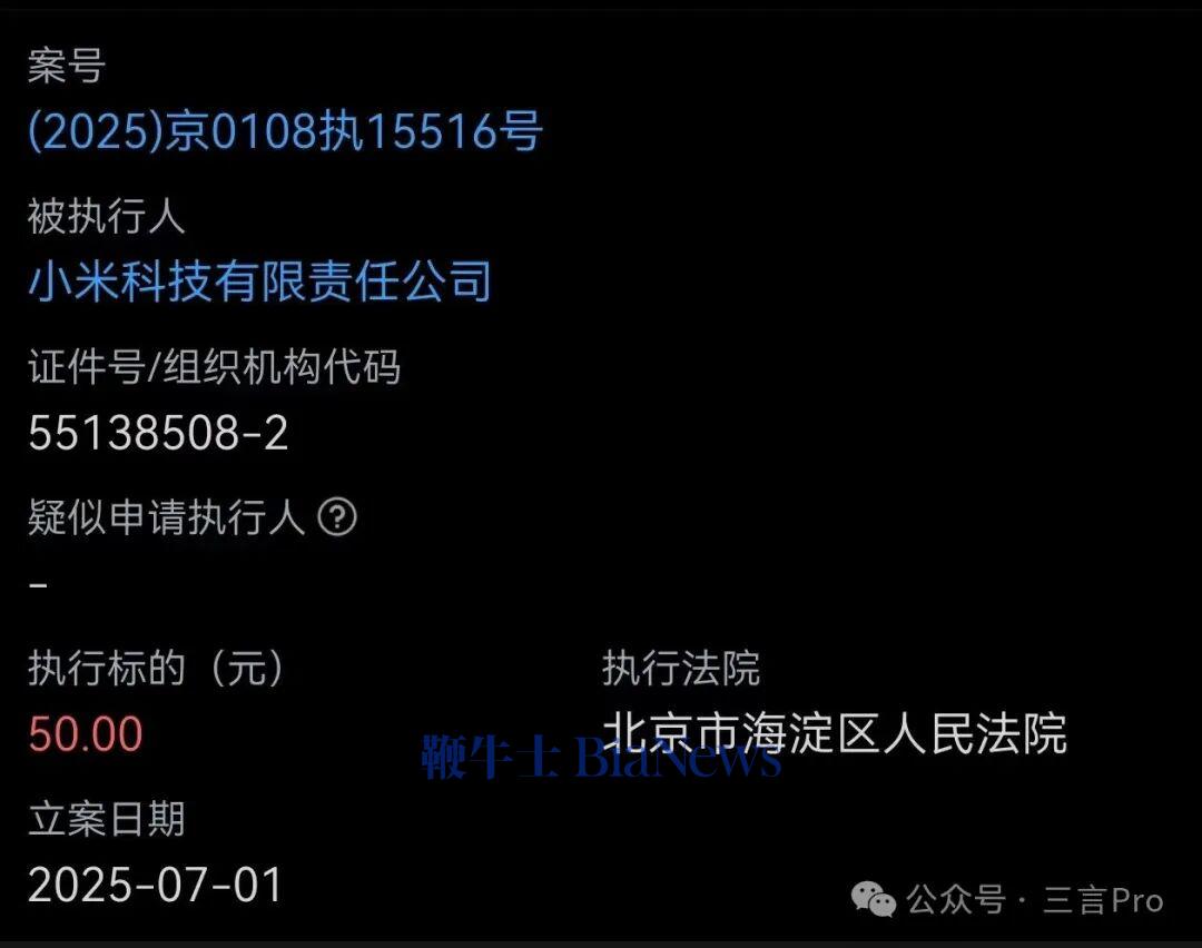 据天眼查显示,2025年7月1日,小米科技新增一条被执行人信息,案号(2025)京0108执15516号,执行标的50元,执行法院为北京市海淀区人民法院。