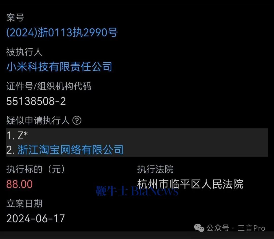 2024年6月17日,小米科技被杭州市临平区人民法院强制执行,执行标的为88元,申请执行人之一是浙江淘宝网络科技有限公司。