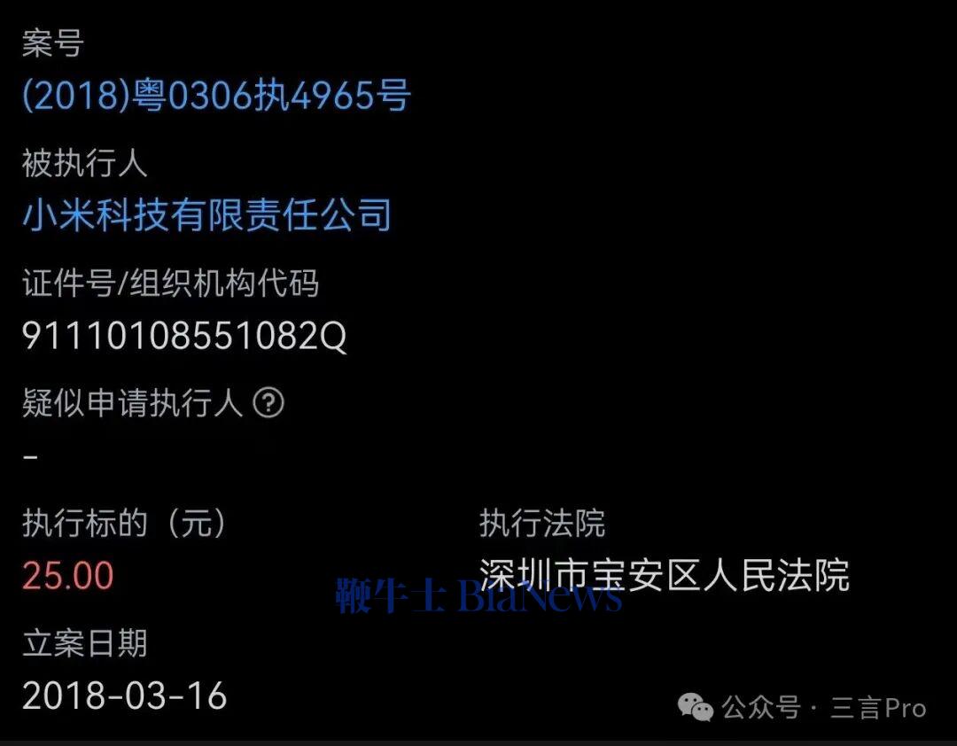 2018年3月16日,小米科技曾被深圳市宝安区人民法院强制执行,执行标的为25元。
