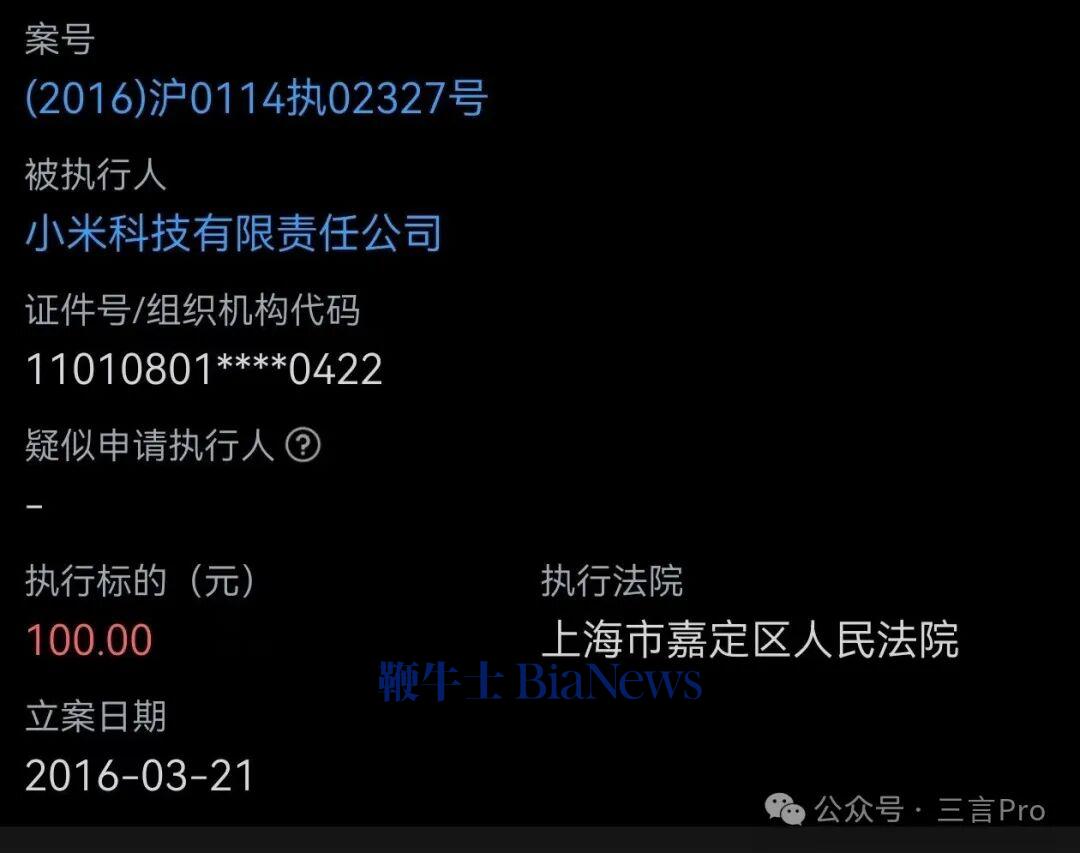 2016年3月21日,小米科技还曾被上海市嘉定区人民法院强制执行,执行标的为100元。