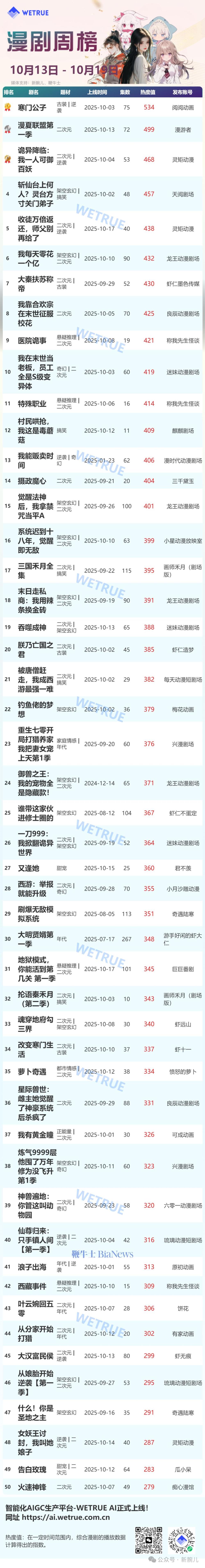 10月20日,新腕儿、鞭牛士联合WETRUE一点查剧共同推出10月第3周短剧漫剧周榜。数据时间周期:10月13日-10月19日上周上榜的漫剧中,二次元题材是主要元素,涉及相关题材的漫剧作品为28部,另外,架空玄幻题材8部,逆袭题材4部。进一步来看,本场榜单呈现出鲜明的马太效应,新腕儿在之前提到的行业现象正进一步显现。榜单中,虾仁系列短剧有5部,也就是熊猫头类漫剧。另外是“龙王动漫剧场”,上榜短剧4部。榜单第一名为古装逆袭题材《寒门公子》,热度值534,为@阅阅动画账号所出,也是全场第一部热度值超过500w的漫剧。虽然古装类漫剧占比并不多,不过,仍是比较受用户关注的一大类型。