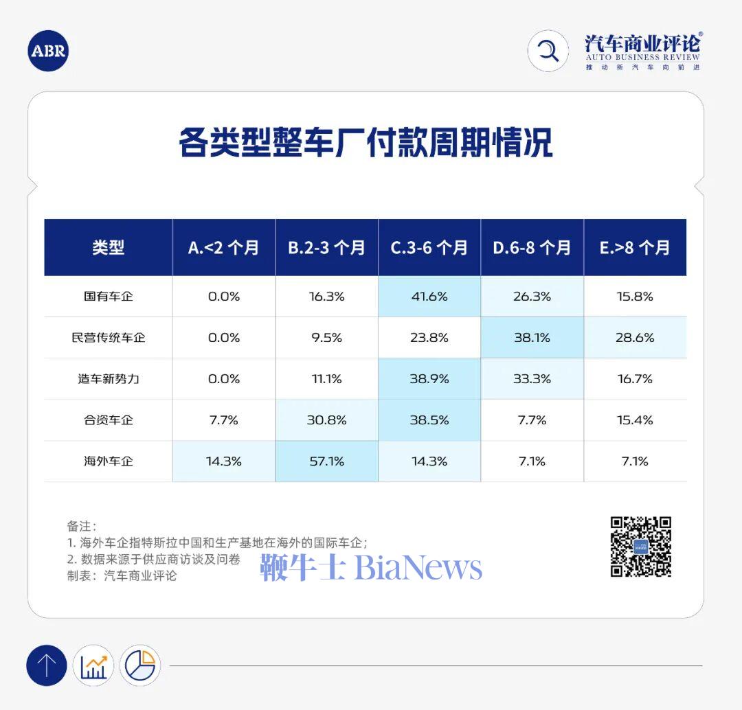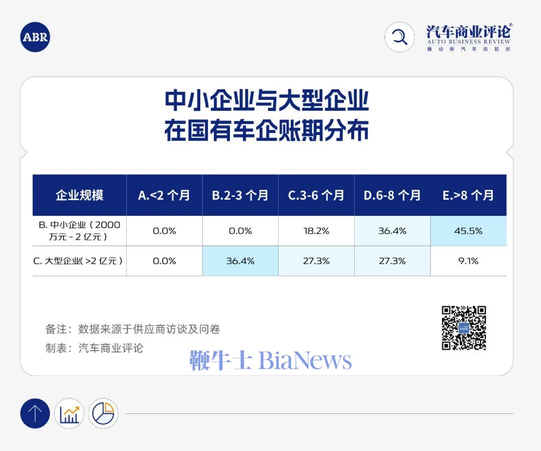 在此次采访的“中小企业”中,有八成表示整体账期在6个月以上,四成表示央国企付款速度不会比其他车企更快;只有不到一成直接收到现金。