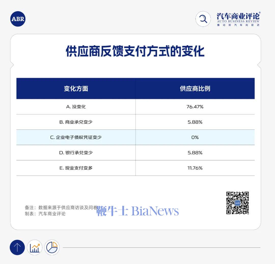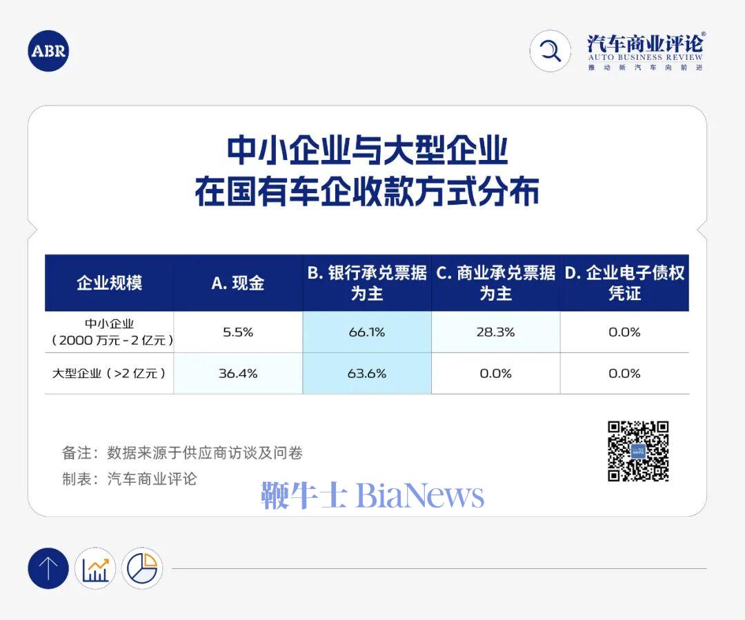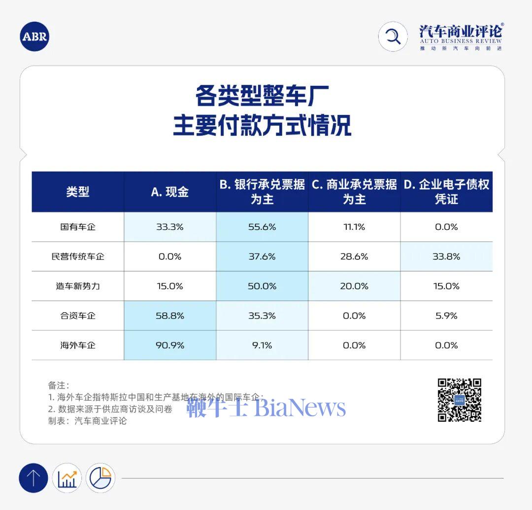 例如合资和海外车企大多选择现金支付,央国企普遍采用银行承兑汇票,而民营和新势力则使用商业承兑汇票或电子票据凭证。