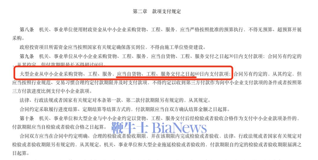 而且,这个条例还明确规定大型企业,“将逾期未支付信息纳入企业年度报告,通过国家企业信用信息公示系统公示,并将保障支付工作纳入风险控制与合规管理体系,督促全资 / 控股子公司及时付款。”