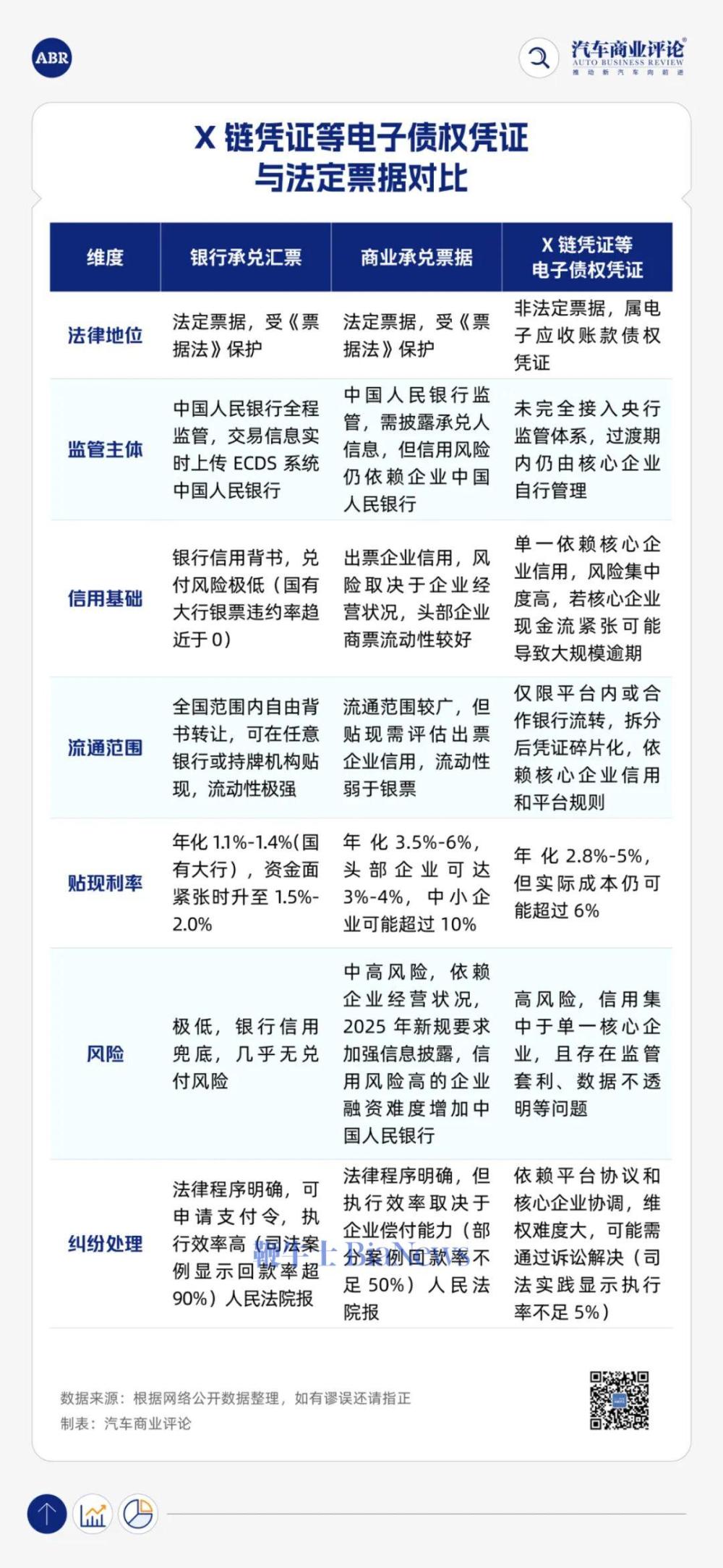实际上,X链不属于银行承兑汇票或票交所监管票据,更不在央行监管内,其贴现本质上是基于X公司信用的应收账款转让,是车企通过延长账期占用供应商资金的模式。