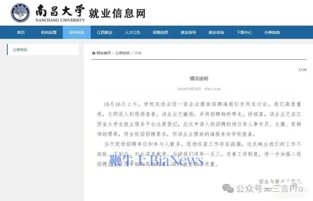 但随着争议越来越大,南昌大学招生与就业工作处10月20日发布声明回应称,该企业已在江西省大学生就业服务平台注册登记,此次申请入校招聘的岗位有人事专员、主播、剪辑师助理等,符合校园招聘要求,但该企业摆放的海报未向学校报备。