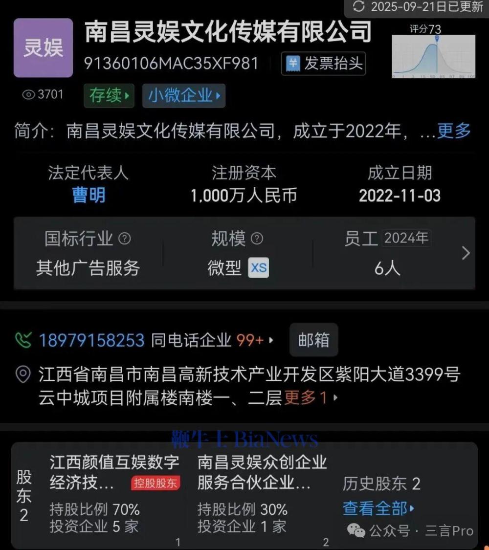 另据天眼查,灵娱文化全称“南昌灵娱文化传媒有限公司”,成立于2022年11月3日,注册资本1000万元。2024年公司参保人数6人。大股东为江西颜值互娱数字经济技术有限公司,持股比例70%。