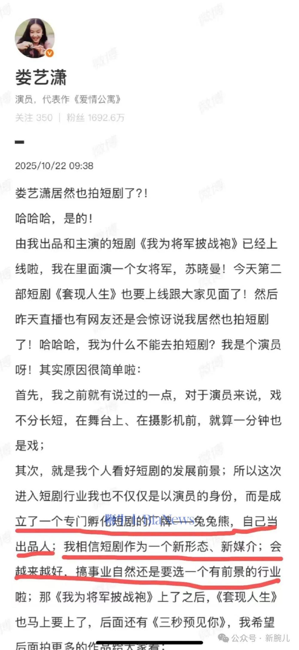 10月22日消息,演员娄艺潇对于自己出演短剧的事情,在微博确认,表示自己已经演了两部短剧了,分别是《我为将军披战袍》和《套现人生》,都在这两天陆续上线了。除了做短剧演员,她还成立了一个专门孵化短剧的厂牌——兔兔熊,自己亲自做短剧出品人。对于短剧这种内容形式,她说,“我相信短剧作为一种新形态、新媒介,会原来越好,搞事业自然还是要选一个有前景的行业。”最后,她说自己精力很旺盛,不太能闲下来,所以这些年她一直在拥抱各种新事物,“喜欢躺平的努力让自己有资格躺平,喜欢折腾的可以学我多折腾折腾。”在娄艺潇发布的这段内容中,虽然开头结尾都在介绍其新上线的两部短剧,做对应的宣传,不过,也给到自己关于短剧近况的介绍。就在7月份,新腕儿发布《爱情公寓》女主娄艺潇初次拍短剧上热搜报道了娄艺潇拍短剧的事情,当时拍摄的短剧就是《我为将军解战袍》。时隔四个月,该剧前两天上线了,在红果热度值3039万,主打无厘头轻喜剧。明星们还在继续进场。他们不止来短剧行业拍戏,还进行相关商业布局,一定程度上反映出大家对短剧内容价值的认可。像是黄晓明,正布局短剧经纪业务。期待更多优秀影视从业者加入短剧。