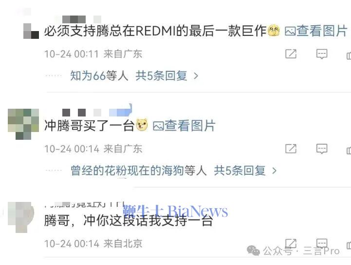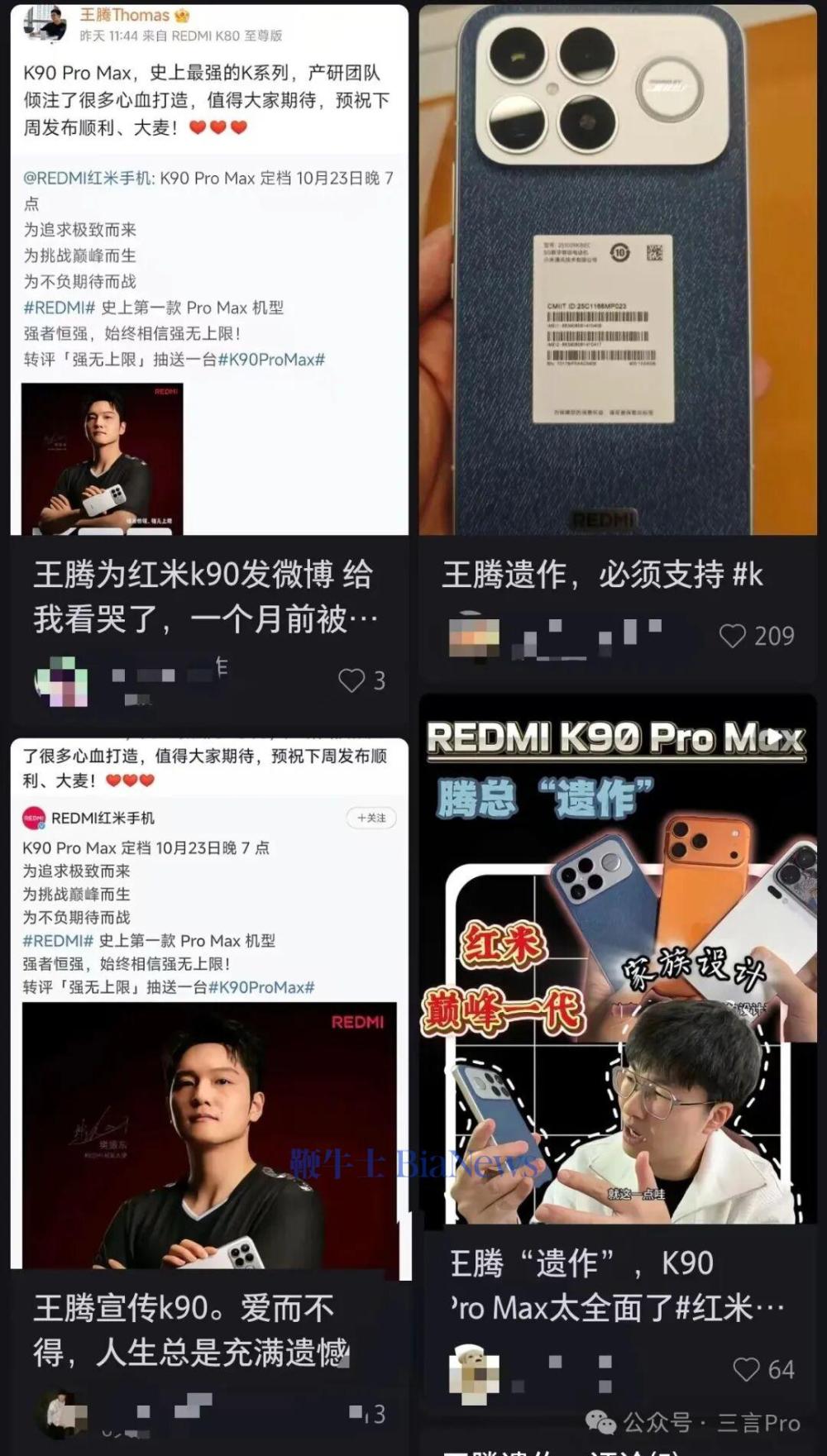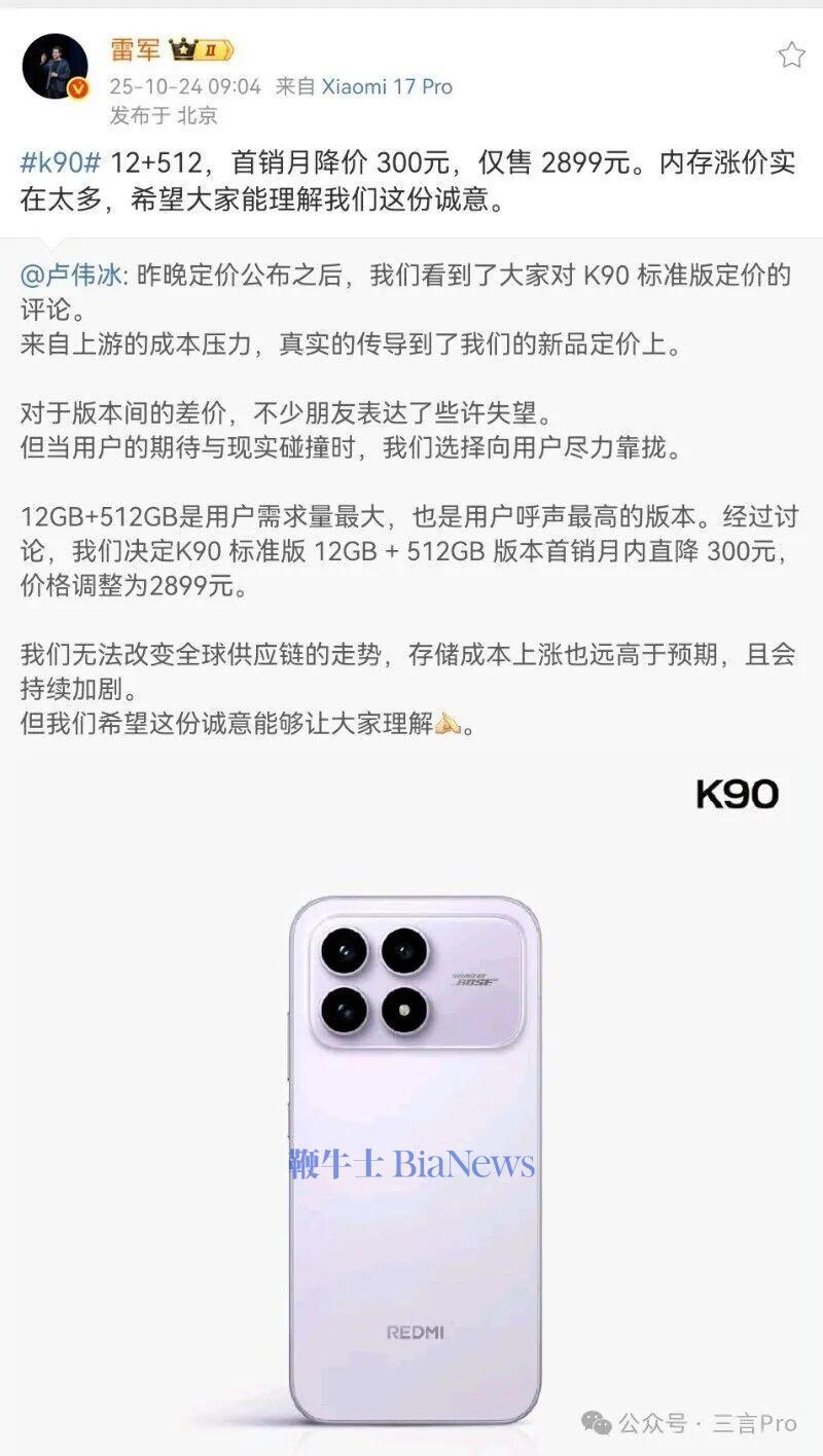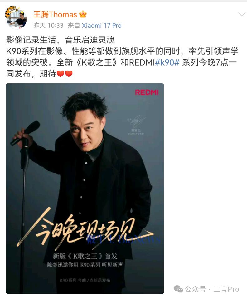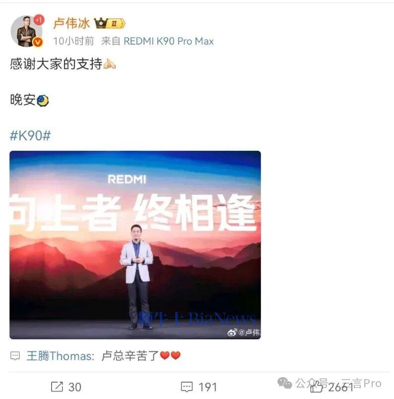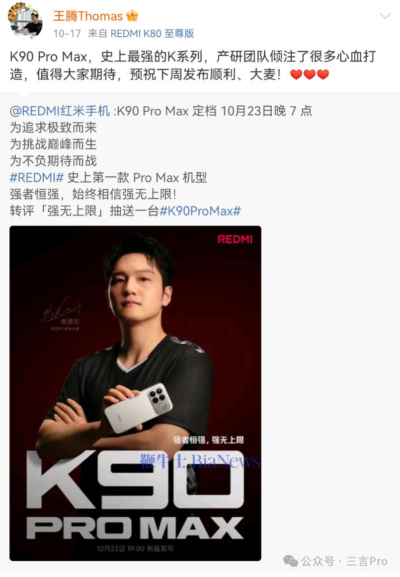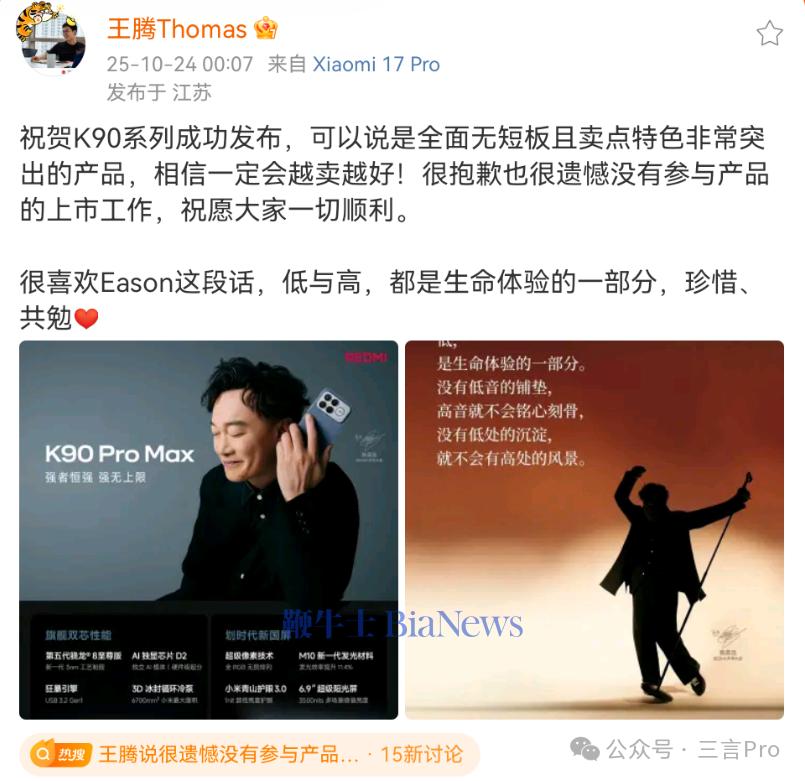 10月23日,REDMI正式发布年度旗舰REDMI K90系列,包括REDMI K90 Pro Max和REDMI K90两款机型。今日凌晨,王腾发微博称,祝贺K90系列成功发布,可以说是全面无短板且卖点特色非常突出的产品,相信一定会越卖越好。他还表示,很抱歉也很遗憾没有参与产品的上市工作,祝大家一切顺利。而话题“王腾说很遗憾没有参与产品上市工作”也登上了微博热搜。王腾在被小米辞退后,其微博账号自9月9日起发布辟谣信息后基本再无更新。但在小米方面开始为REDME K90预热时,王腾连续多日为这款手机“打call”。10月17日,王腾转发红米手机官宣发布会时间的相关微博,并表示K90 Pro Max产研团队倾注了很多心血打造,预祝发布顺利。10月23日上午,王腾特地发微博宣传REDMI K90系列发布会。10月23日晚,REDMI K90系列发布会后,王腾还点赞了小米卢伟冰的相关微博,并表示“卢总辛苦了”。很多网友认为,REDMI K90系列是王腾“遗作”,为表支持特地购买这款手机。有网友在社交平台上更是表示看到王腾的微博直接落泪;因为这次REDMI红米手机请来陈奕迅代言,甚至还有网友将其歌曲《K歌之王》解读为:“K是红米K系列,王是王腾的王”。据悉,此次REDMI K90系列发布后,其定价较高引发了大量讨论。今日,卢伟冰和雷军均针对定价问题发声。卢伟冰表示,“来自上游的成本压力,真实的传导到了我们的新品定价上。12GB+512GB是用户需求量最大,也是用户呼声最高的版本。经过讨论,我们决定K90 标准版 12GB + 512GB 版本首销月内直降 300元,价格调整为2899元。我们无法改变全球供应链的走势,存储成本上涨也远高于预期,且会持续加剧。但我们希望这份诚意能够让大家理解。”雷军也转发了卢伟冰相关微博,并强调内存涨价实在太多,希望大家能理解。(转载自三言Pro)