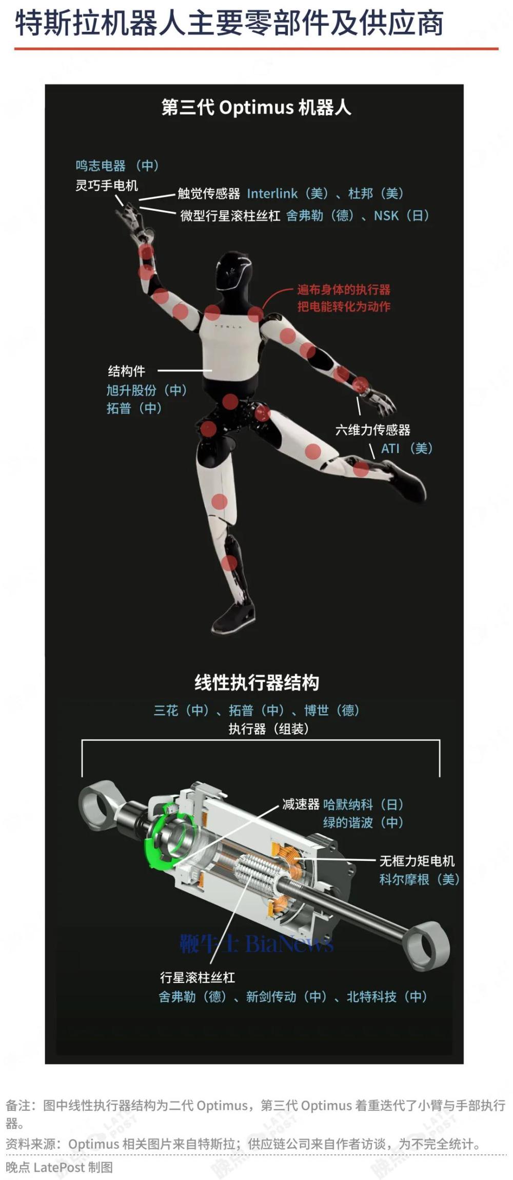 大部分零件已设计定型,都在等手 今年 7 月,特斯拉曾暂停 Optimus 零件采购,重新设计了部分零件。据供应链透露,特斯拉已基本确定灵巧手和前臂以外的零部件供应商。今年 9 月,特斯拉恢复零件采购并开始生产没有手的 Optimus,每周产能超过 200 台。 这些改动的直接目标是为了让 Optimus 完成一场惊艳外界的现场展示,而非让它具备马斯克此前承诺的足以与人媲美的智能和灵活性。 “所有人形机器人公司都频繁更新视频。因此,马斯克需要一个完美的产品和一场惊天地泣鬼神的发布会,让 Optimus 显著领先对手。比如让机器人和他一起在台上跳舞或者与投资者面对面互动,而不只是发个视频。” 一位特斯拉供应商高管说。 今年以来,马斯克已经在 Optimus 上做了很多承诺。他声称特斯拉未来 80% 的价值将来自于机器人,并随后买了 10 亿美元特斯拉股票。 供应链信息显示,为了让灵巧手更灵活且具备更强的感知能力,特斯拉在 7 月的调整中将灵巧手执行器数量从 17 个提升至 22 个,并在手掌部位增加电子皮肤传感器。 这些改动目前仍面临较大的工程难题。 Optimus 的灵巧手依旧面临电机散热不足、部分零件使用寿命短等问题。一位人士称,Optimus 灵巧手的使用寿命不超过两个月,覆盖在手指和手掌的柔性电子皮肤会在 Optimus 摸东西时加速磨损,驱动手指的腱绳容易老化断裂。 马斯克说,为了模拟人手的能力,特斯拉工程师甚至去请教外科医生,研究人手的肌肉和发力机制。 增加自由度后,灵巧手内的执行器排布更难,特斯拉要重新设计机械结构和电路,在已经塞入 17 根钢笔帽大小的微型丝杠和数十个电机的手掌中,再多塞 5 根丝杠和电机。灵巧手中的精密金属齿轮会在高频共振和转动中磨损,丧失精度。 一位供应商曾告诉我们,灵巧手还会因运动控制算法失效而损坏,比如机器人可能会失控将手砸在桌面上。结构精密的灵巧手坏了只能换,没法修,每只灵巧手成本超过 6000 美元。 机身也在继续改进,寿命、效率还无法胜任工厂工作 马斯克表示,有些设计问题可能要在量产后才会暴露,所以在目前等待量产阶段,Optimus 的设计还在不断调整,并且大规模量产后也会继续改进设计。 这是因为 Optimus 的性能还没达到特斯拉的设计目标,跟替代人的目标还有相当距离。 Optimus 体重小于绝大部分全尺寸人形机器人,且更苗条纤细。这是因为机器人执行器的集成化程度更高,工程师能在更小的体积下塞入更多元器件。一位供应商估算,三代 Optimus 的关键执行器体积比上一代小了约 10%。但还没达到马斯克的目标。 Optimus 的身体有诸多调整——腰部执行器中的四个谐波减速器更换为新型减速器,以提升 Optimus 的承重能力;重新设计了更轻的减速器及电机,以减轻体重。 马斯克期望三代 Optimus 在二代(56.6 公斤)的基础上减重 10 公斤,以增加续航。目前工程团队只完成了 70%,减重 7.3 公斤。 这些改进或许能让 Optimus 略强于 Figure AI 和一众中国公司的机器人,但这依然不足以支撑马斯克要通过机器人改变全球经济结构的叙事。马斯克在昨天的业绩电话会上再次强调,大规模部署 Optimus 意味着无限的金钱,Optimus 每年的生产力可能是人的五倍,它可以 7x24 小时运行,甚至不需要充电,插着电源就行。 但综合多位供应商说法,除了手以外,Optimus 的手臂、腿部的多个关节执行器使用寿命和稳定性也不达预期。 从走路到拿东西,Optimus 的各种动作都会磨损关节活动需要的精密部件,而且不会像人体那样自我修复。减速器等精密器件的使用寿命普遍为 8000 小时,8 小时工作制下能用不到 3 年,坏了只能换。行星滚柱丝杠的使用寿命更低。 这类潜在的工程问题仍需大量时间调试修正。“特斯拉团队相信只要硬件设计思路正确,精度和可靠性的提升是可预见的。但工程师有时会低估这需要的时间和资源。” 前述人士说。 一位机器人公司高管称,二代 Optimus 在汽车工厂工作的平均速度只有人类的 20%~30%,只有极个别简单动作能到人类速度的 60%,三代 Optimus 搬东西的效率提升了一倍,但依然显著慢于工人。 研发阻碍并不影响特斯拉上调产能规划 我们接触的特斯拉供应商都是在昨天凌晨才从马斯克口中得知,特斯拉要在明年底把 Optimus 的产能拉到 100 万台每年。 这些供应商都认为,计划肯定会变。就在最近几周,特斯拉采购部门还在摸排供应商产能准备情况,已要求部分供应商在明年 10 月将零件产能拉到每周 1000 台,并在明年 12 月将产能拉到每周 2000 台——大约一年 10 万而已。 马斯克曾将 Optimus 形容为一个比 Model X 更难,但比登火星的 Starship 简单的技术问题。Optimus 的难题在于,特斯拉没有可以参考的对象,工程师要重新研发几乎所有零件,真正做到垂直整合。特斯拉 20 年前做电动车时,它至少不需要重新设计方向盘、轮胎。人形机器人的零件数量大概 7000 个,比汽车少 30%,大部分都要重新做。 但至少特斯拉这次得到的供应链支持比 20 年前强的多。 即使供应商对技术难度、从未兑现过的量产时间表有诸多抱怨,但也没人会拒绝特斯拉。给特斯拉供货不仅意味着订单,还有技术扶持。一位知情人士称,一家特斯拉选定的供应商做了两年无框力矩电机,依然无法满足特斯拉要求,特斯拉自己解决了问题,把图纸和技术方案授权给他们代工生产。 进入特斯拉供应链对供应商股价的拉动也是动力之一。一位二级