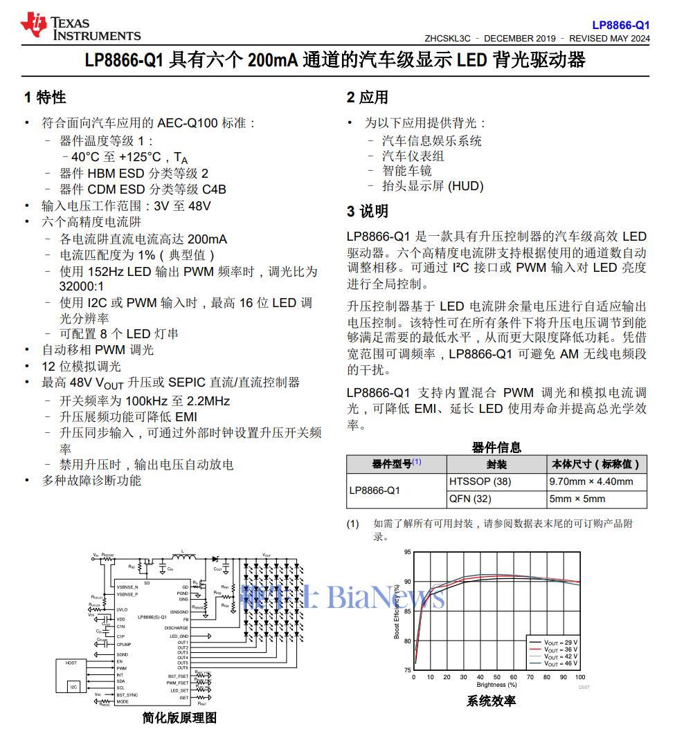 LP8866QRHBRQ1:这是德州仪器的一款汽车显示 LED 背光驱动器。它具有 6 个高精度电流阱,每个电流阱直流电流高达 200mA,电流匹配度为 1%。支持通过 I²C 接口或 PWM 输入对 LED 亮度进行全局控制,调光比最高可达 32000:1。其输入电压工作范围为 3V 至 48V,开关频率最高可达 2200kHz,还具备多种故障诊断功能,如 LED 开路检测、LED 短路到地检测等,符合 AEC-Q100 汽车应用标准。