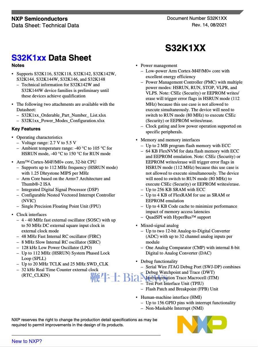 FS32K144HFT0VLLT:恩智浦的一款高性能汽车通用MCU,S32K144 32-bit MCU, ARM Cortex-M4F, 512kB Flash, 80MHz, CAN-FD, FlexIO, 105°C, LQFP 100。