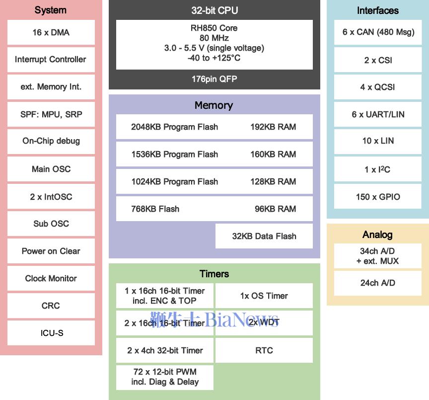 中控屏搭载两颗MCU(瑞萨 R7F7010233AFP、恩智浦FS32K144HFT0VLLT),两颗不同供应商的异构MCU或为满足ASIL-D级功能安全,避免共因失效,推测其功能包括屏初始化、故障监控、扩展接口控制等,可能运行AutoSAR系统,因此选用大内存、大Flash 型号。
