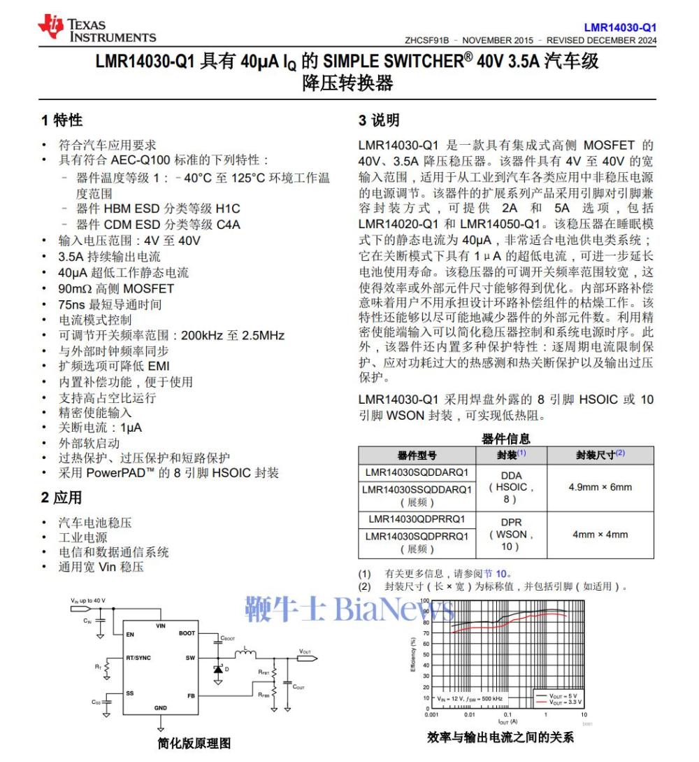 LMR14030SQDDARQ1:德州仪器的一款具有 40uA IQ 的 SIMPLE SWITCHER®、汽车类 40V、3.5A 2.2MHz 降压转换器。其输入电压范围为 4V 至 40V,输出电压范围为 0.8V 至 28V,可通过外部电阻灵活配置,输出电流持续 3.5A、峰值 6.6A。开关频率固定为 2.2MHz,高频开关可减小电感尺寸,同时降低输出纹波,适用于为中控屏幕的不同电路模块提供稳定的电源供应,如主控芯片、显示屏驱动电路等。