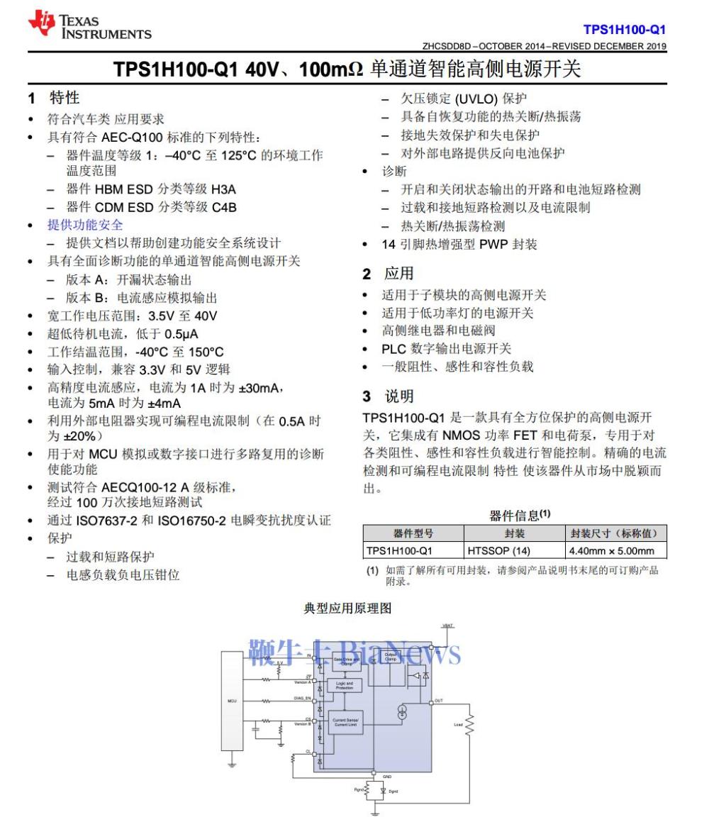 TPS1H100AQPWPRQ1:德州仪器的具有可调节电流限制的 40V、100mΩ、汽车类单通道智能高侧开关。输入电压范围 3.5V 至 40V,兼容汽车 12V/24V 系统,输出电流持续 4A、峰值 13A,导通电阻 80mΩ,具有高精度电流检测和诊断能力,可用于控制中控屏幕四个外设接口的 9V 电源开关,实现对外部设备的电源管理和保护。