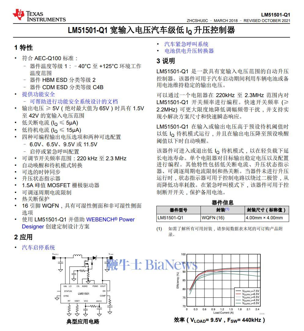 LM51501QRUMRQ1:德州仪器的一款低 IQ 升压控制器。宽输入范围为 1.5V 至 42V,开关频率可通过电阻器在 220kHz 至 2.3MHz 范围内调整,在输入或输出电压超过预设待机阈值时,进入低 IQ 待机模式运行,当输出电压低于预设唤醒阈值时自动唤醒,可在汽车由蓄电池或备用电池起动时保持稳定的输出电压,为中控屏幕的部分电路提供稳定的升压电源。