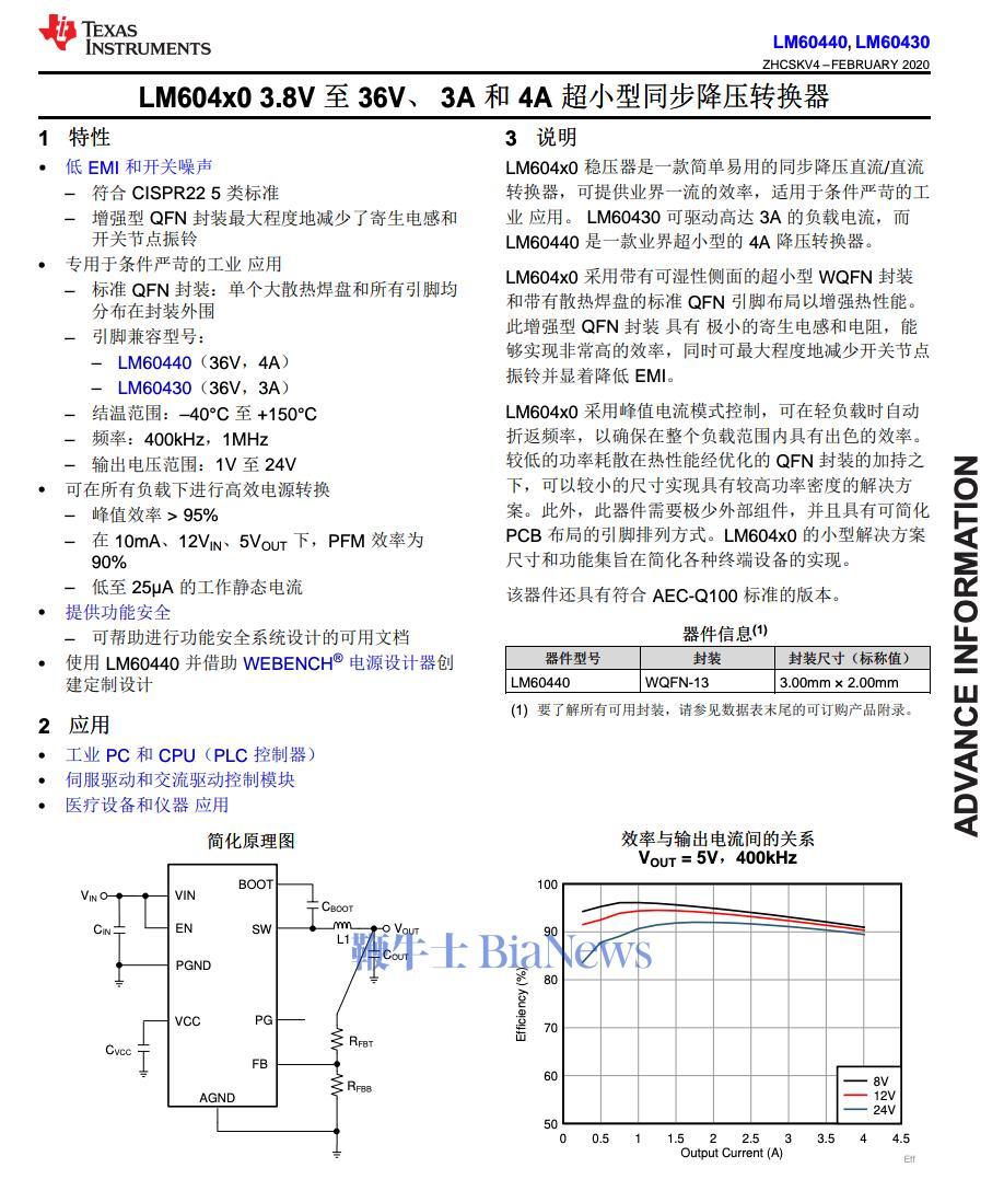 LM60440:德州仪器一款用于电源管理的芯片,采用增强型 EMI QFN 封装、具有可湿性侧面和外部焊盘的 36V、4A 同步转换器。