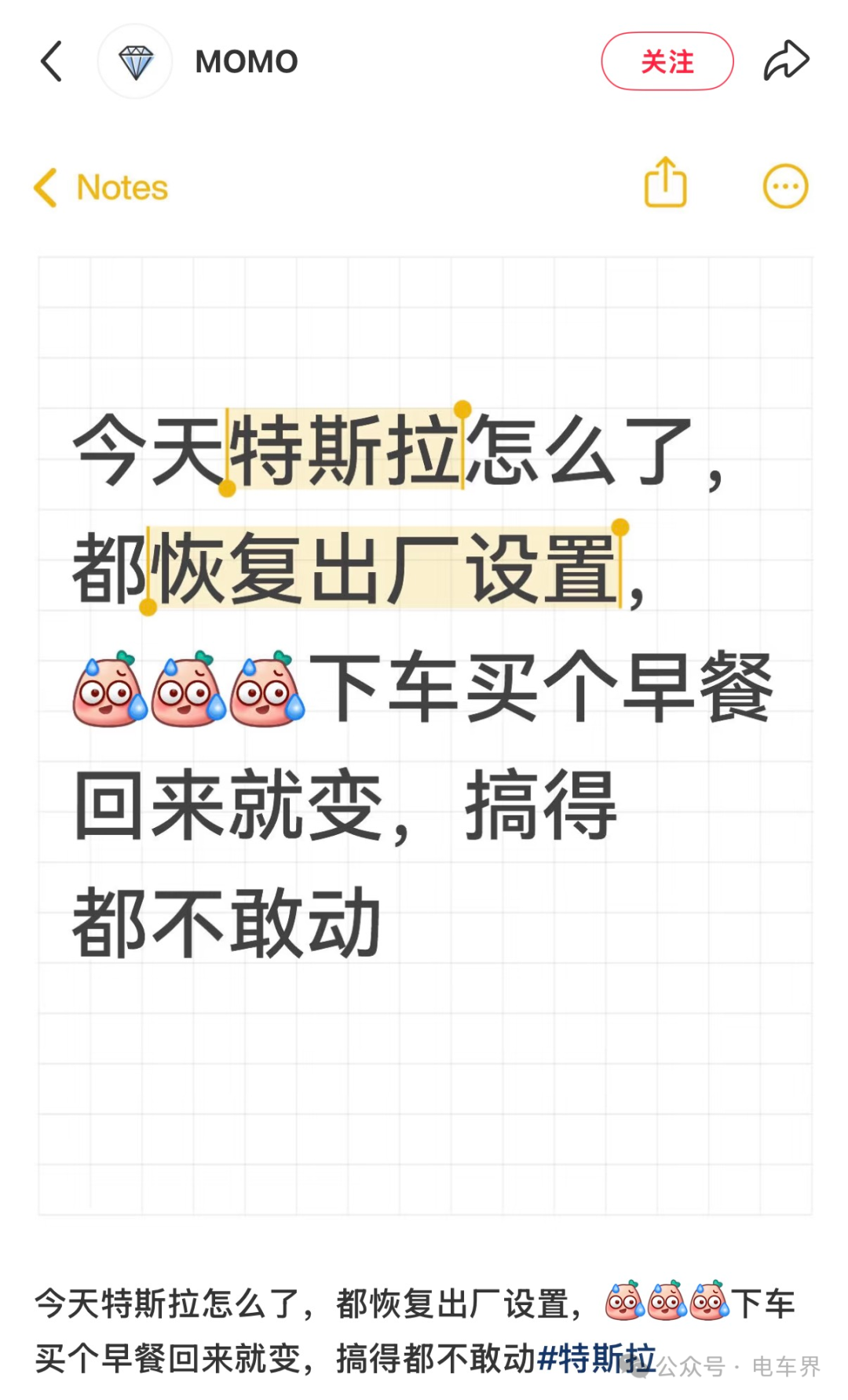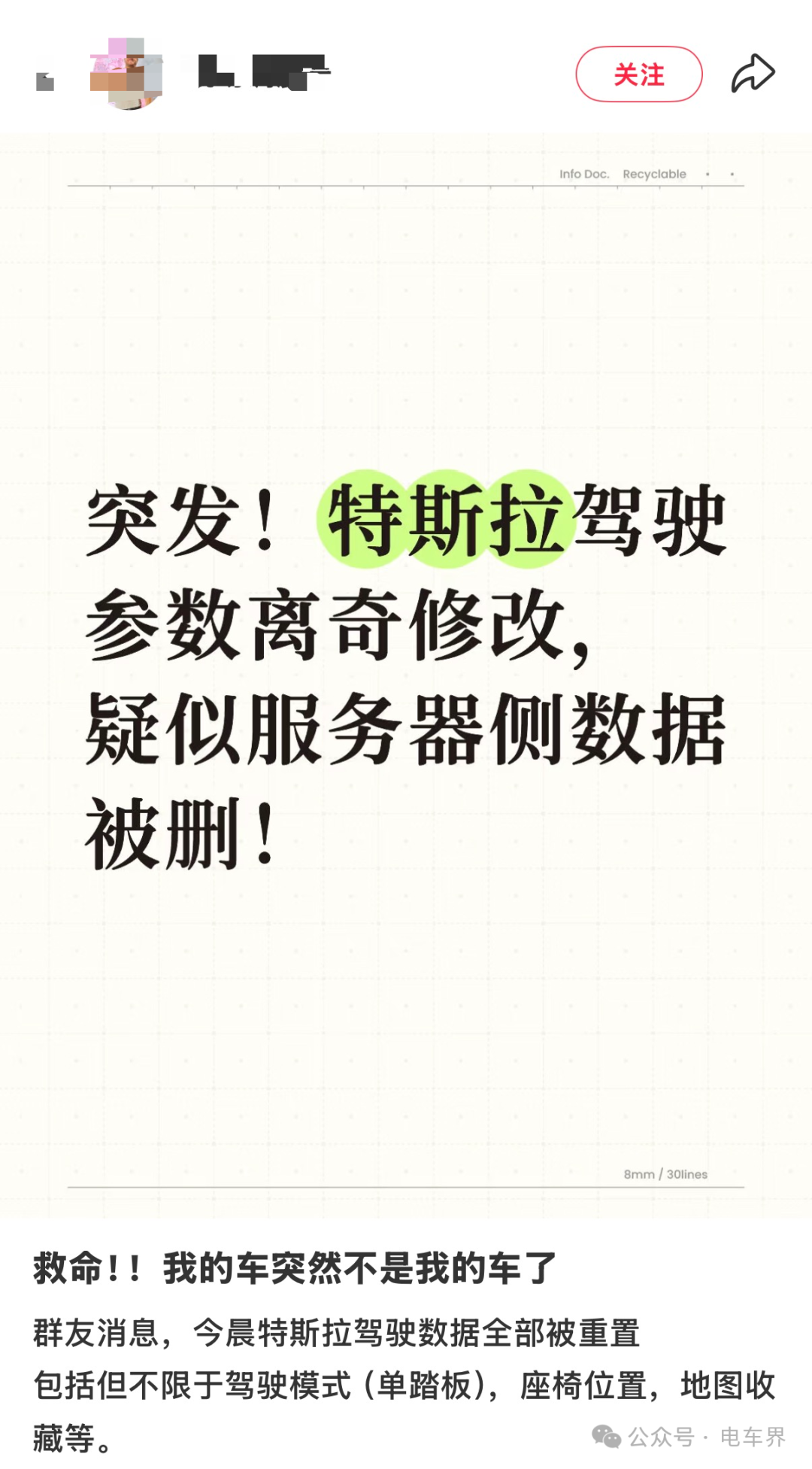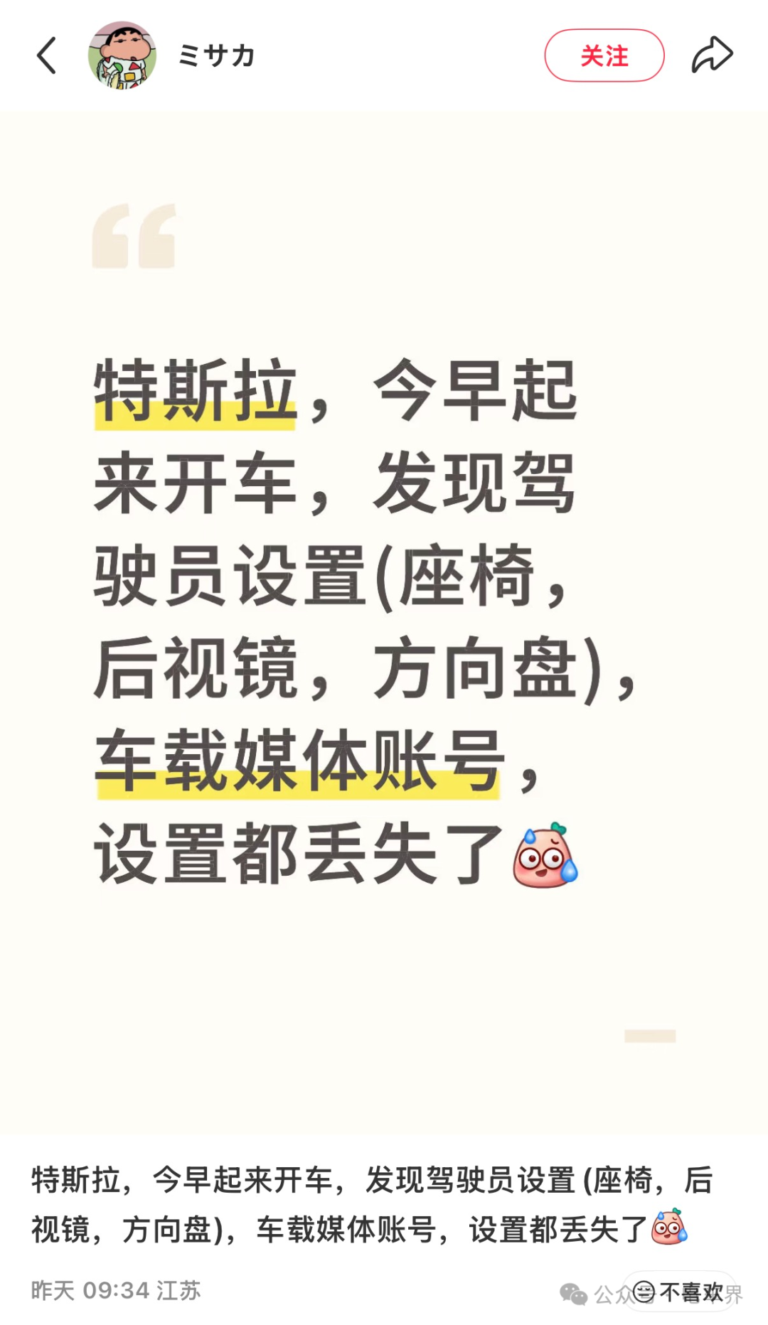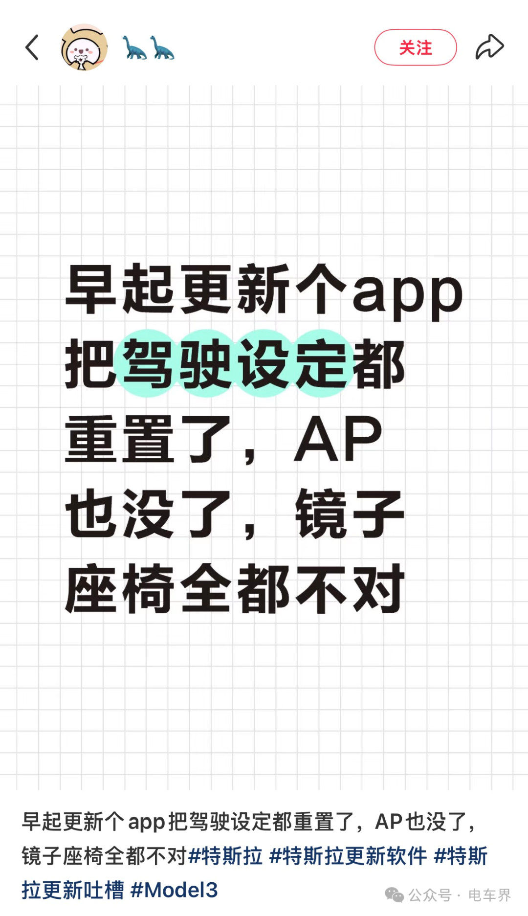 有网友称,早起更新个app把驾驶设定都重置了,AP也没了,镜子座椅全都不对。