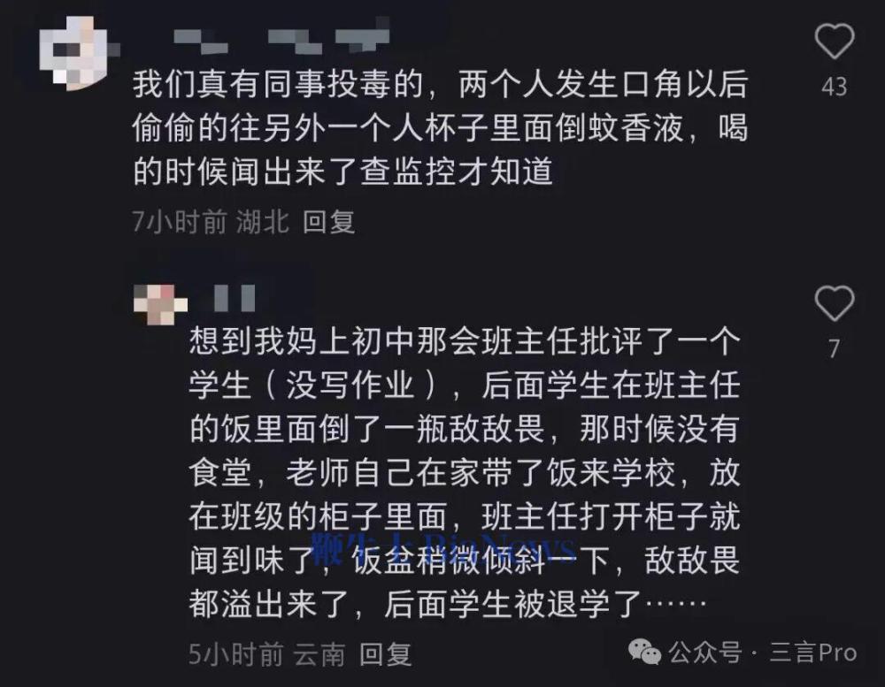 还有网友透露真有同事投毒的,两个人发生口角后,偷偷往另一个人被子里倒蚊香液,喝的时候闻出来查监控才知道;
