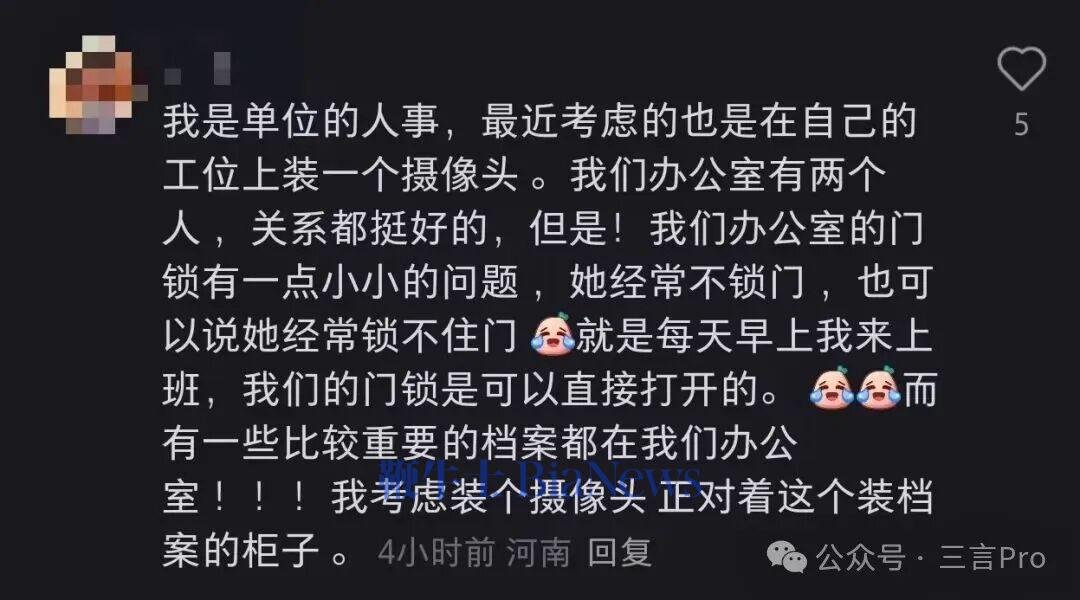另一位网友称自己之前有同事手脚不干净,在和身后同事打过招呼后也装了摄像头;