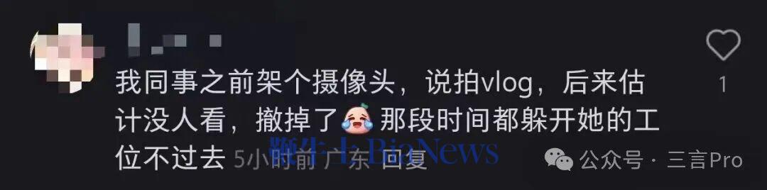 有网友称,自己同事之前装了摄像头,说是拍vlog,但是后来可能因为没人看就撤掉了。该网友称那段时间都不敢去她工位。