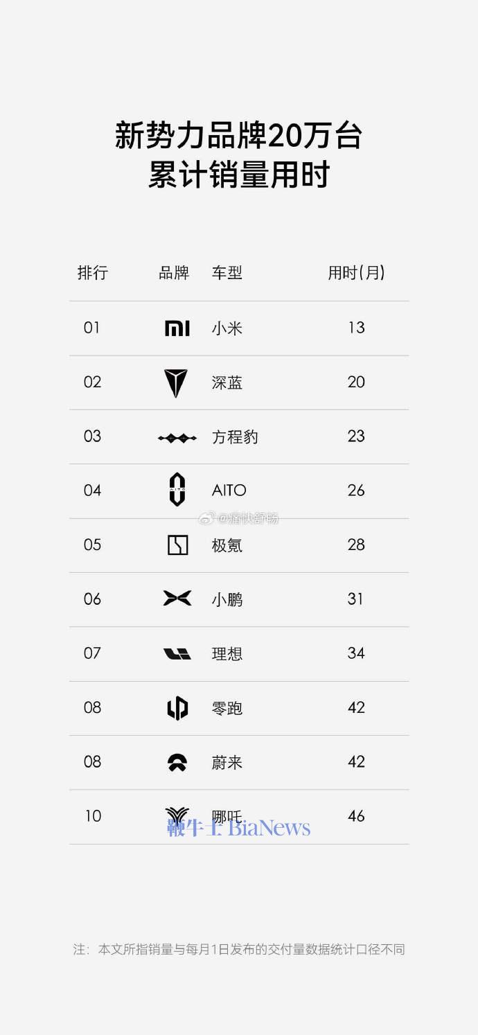 据悉,方程豹品牌23年11月正式开始交付。新势力品牌20万台累计销量用时排行榜显示,方程豹品牌用时23个月达成20万辆,目前位居第三,仅次于小米汽车、深蓝汽车。