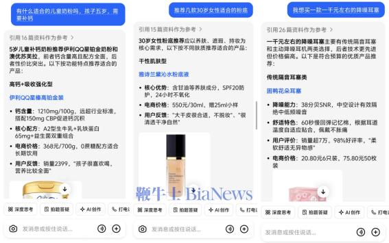 国内互联网公司中,淘宝8月下旬开始测试“AI万能搜”,用户提问后,淘宝会推荐购买攻略、商品口碑、优惠信息等。今年双11期间,淘天一口气推出六款AI导购应用,包括“AI万能搜”“AI帮我挑”“拍立淘”等,覆盖众多购物场景。