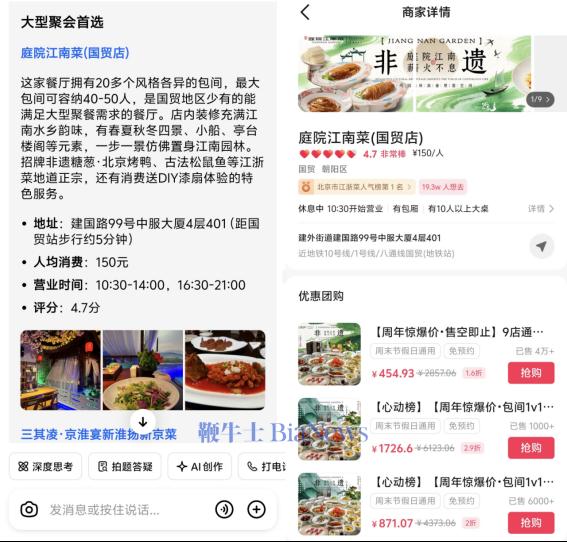 与电商商品相比,豆包在推荐团购套餐时靠谱了许多,信息准确而丰富。这或许与抖音团购套餐的供给较为单一和固定,信息聚合复杂度低有关。