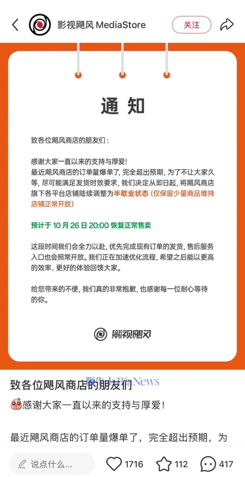 严格来说,是影视飓风旗下的电商业务。10月22日,官方影视飓风MediaStore发公告表示,因订单量爆单将飓风商店旗下各平台店铺陆续调整为半歇业状态,目前正在陆续重新上架产品。