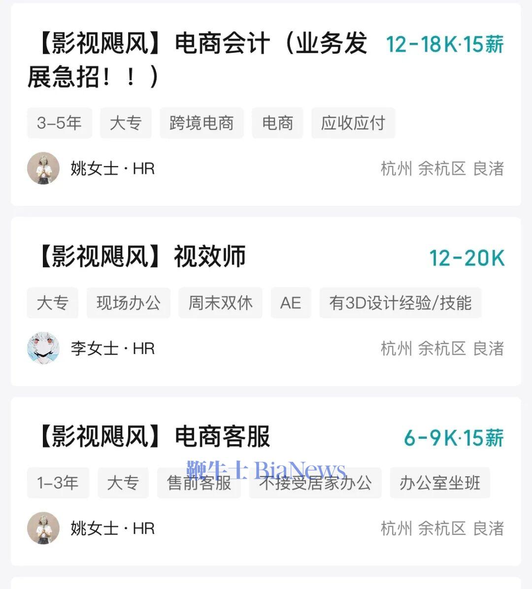 尤其是“核心收入由过去的TVC广告转为电商”这一消息,更是让大众重新认识了影视飓风这家内容公司。近期的爆单,也进一步说明电商业务的快速发展,Tim在采访中提到,仅一件T恤销量就超过20万单。去年,影视飓风的年营业额已经超过1亿,预计今年“会多不少”。在某招聘平台,能看到影视飓风也在招聘电商客服、电商会计等相关岗位。