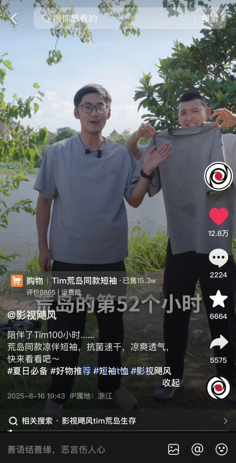 在岛上,Tim穿的正是这件“凉伴”T恤,在荒岛直播中,Tim更是开启带货模式,和产品主管飘逸一起拍摄种草短视频,在直播中用河南话念产品宣传语。这支荒岛出品的种草短视频,在抖音上有超过10万点赞。