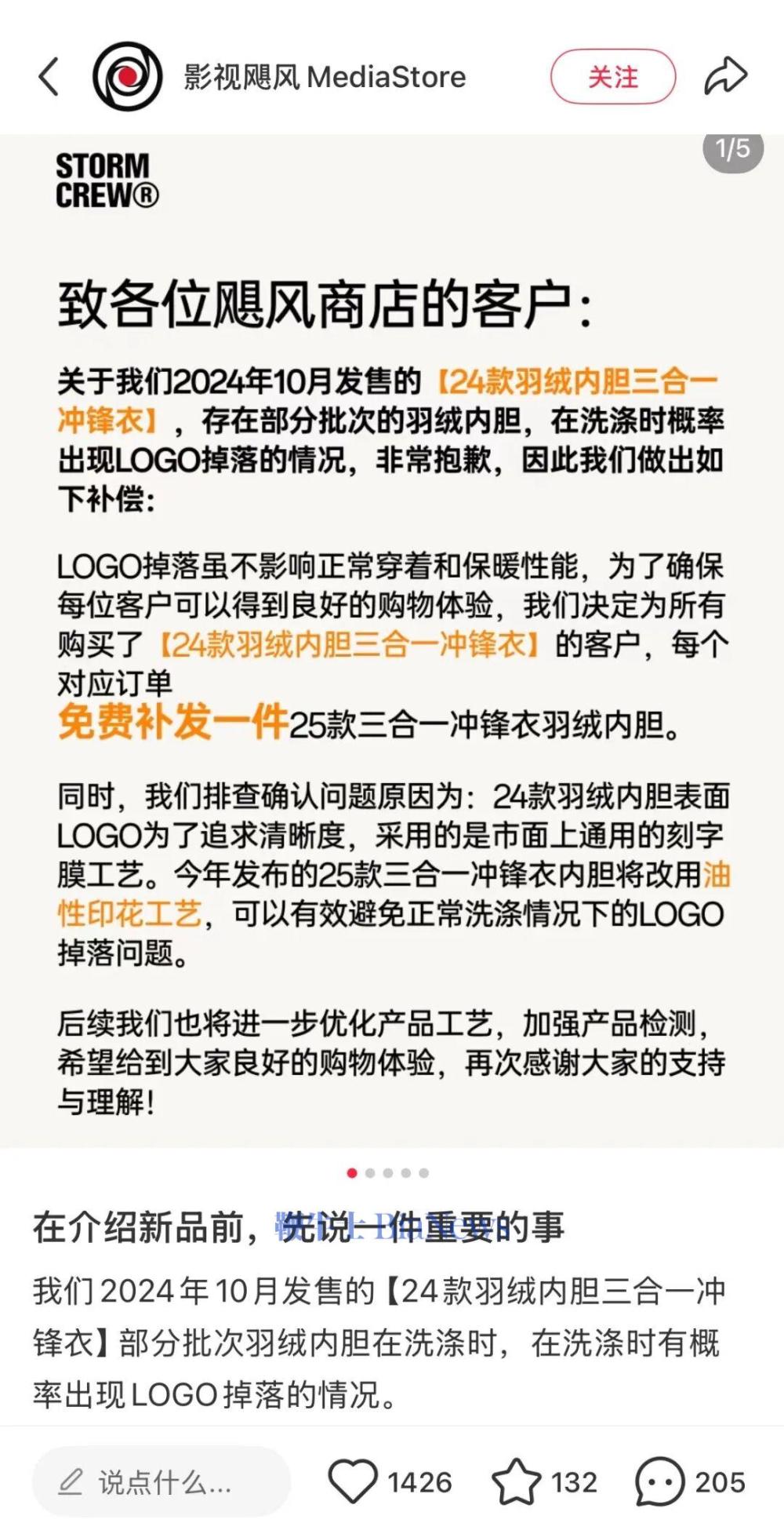 此前24年10月发售的冲锋衣羽绒内胆就出现过掉logo的情况,也被一些消费者避雷,但针对该问题官方明确承认产品问题并表态“为所有购买该产品的消费者免费补发一件新款羽绒内胆。”积极的态度和补偿动作,也顺势拉了一波好感。
