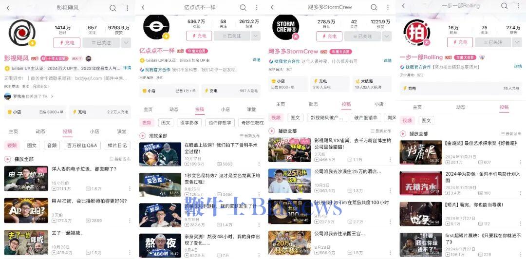 最显著的是影视飓风开始发力内容矩阵账号,目前以“长/短视频”为X轴、“大众/专业”为Y轴,公司分别在四个象限做了内容账号布局,影视飓风对应的是“长视频/专业”。
