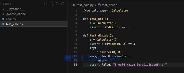 另外我们用最简单的方式看它能不能独立完成一次完整开发。只给它两个文件:一个空的 calc.py,一个测试文件 test_calc.py,要求实现加法和除法,还要能处理除以零的错误。