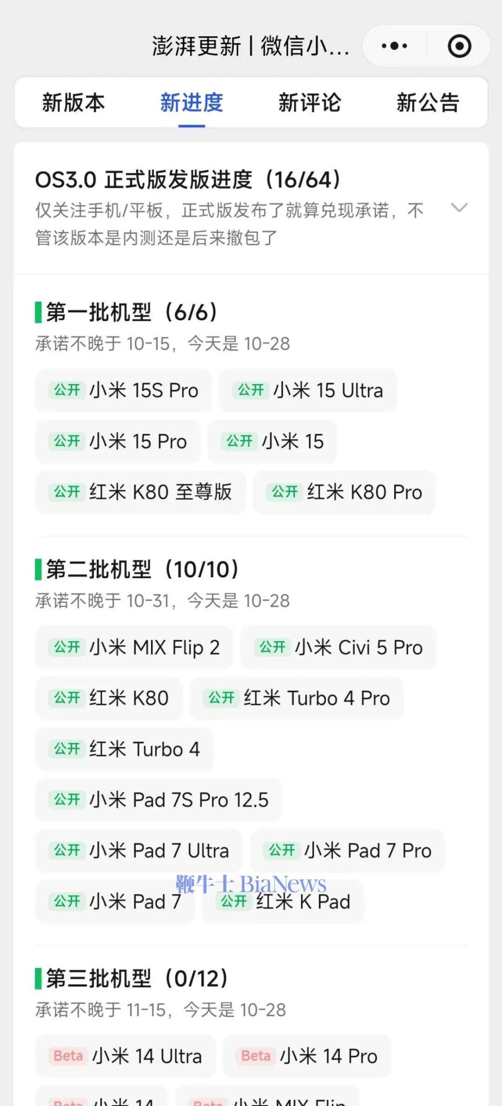 10月28日,澎湃OS 3开始向第二批机型推送正式版,第二批一共十款机型,一次性发版,并且跳过了内测,直接公开推送。