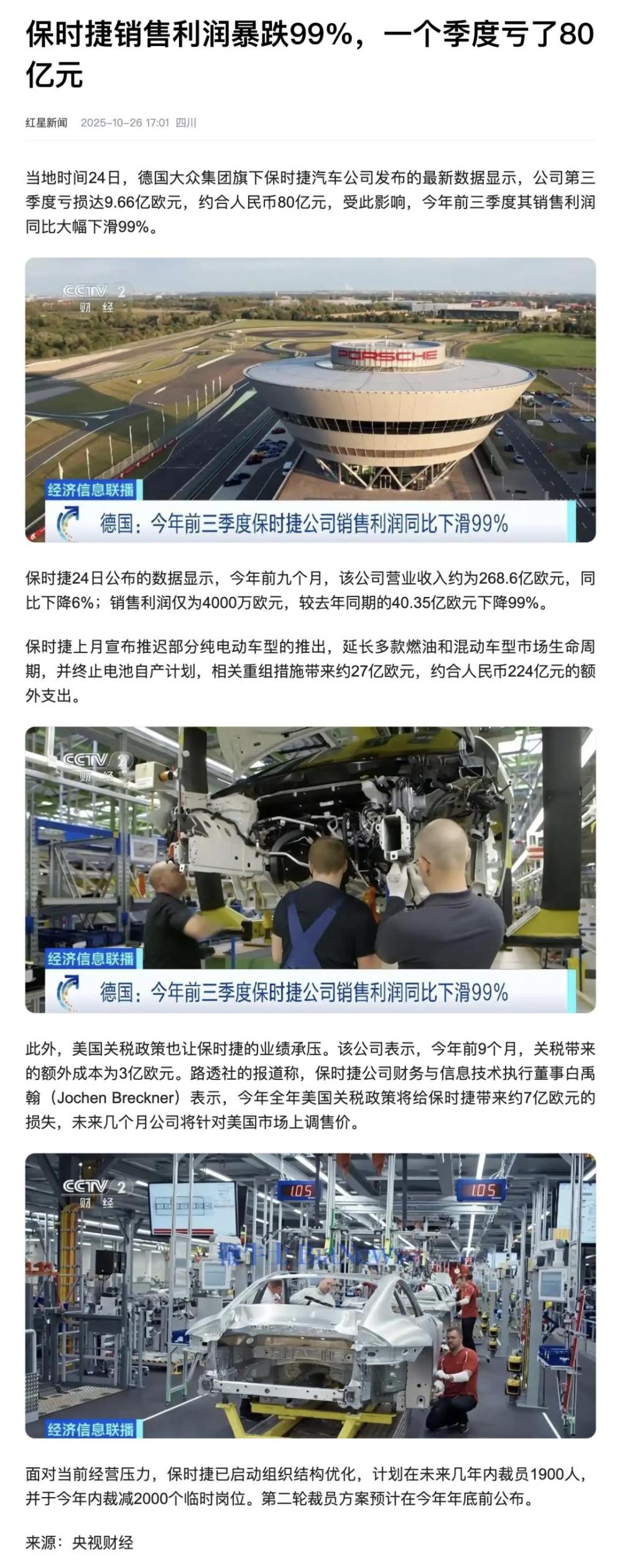 这是半佛仙人的第1903篇原创 1 后台很多人问怎么看小米让保时捷的日子过得不太舒服。 一个非常有趣的新闻,大家可以看一下。 向下滑动查看所有内容 (截图来自央视财经&红星新闻) 就,怎么说呢,保时捷的确过得不太好。 但跟小米关系不大,真的。 如果那个外形和性价比算作威胁的话,众泰当年就应该把保时捷通关了。 人家的皮尺部是真的独步天下,他们那个设计说借鉴都保守了,因为完全没有看出设计的痕迹,是一种很新的科技。 如果人家是时捷,那他们就是时迁。 而且关键价格更是只有保时捷的零头。 但对保时捷没啥影响。 真正对保时捷有影响的,是国产高端SUV,主要是问界和理想。 讲一个不算冷的知识,保时捷大部分时候,都是赔钱的。 在做卡宴和macan之前,本来就是大多数时候都赔钱的,那堆轿跑本来就不赚钱,不然也不能被大众集团给收购了。 你没看错,就连人家保时捷,想要赚钱也靠SUV,靠卡宴。 虽然保时捷出SUV当年让很多品牌粉觉得保时捷背叛了跑车,但确实是拯救了保时捷。 那些当年没有及时出SUV的所谓纯血跑车品牌,下场更是惨得多,是谁我就不说。 前几年保时捷赚钱,也是靠SUV来养轿车。 可以说每一个保时捷跑车的用户都得感谢卡宴和macan车主,真的是靠他们养活。 如果保时捷不够赚钱了,那当然就是SUV部分出问题了,因为轿跑部分的利润一直都那样充满进步空间。 当年保时捷的SUV大卖,说穿了就是很多用户在BBA和路虎以及大G之间有刚需,既觉得BBA门槛有点低,又觉得路虎大G有点太高,那保时捷卡宴确实刚刚好。 可现在,状态就不太好了。 看他们的数据,亏损一方面是财务技术,把电动投入一次性摊销进去,造成短期巨额亏损,但客观上给后来的管理者清负担,可以说是他们的主动选择。 另一方面是被动的,其核心赚钱SUV的领域被国产SUV用一半乃至更低的价格给打出暴击了。 再说一遍,这部分其实是被理想和问界给弄的。 说白了,不管是论配置,还是论价格,论智能化,确实产品力上是跟国产比太不够卷了。 能被理想和问界弄成这样,确实是这么多年在智能化上他们做的一言难尽。 那个车机跟其他的一比,就像是原始人到了二十一世纪。 再昂贵的红木家具用起来也不如新的智能家居舒服啊,有钱人也想要舒服啊。 过去是没辙,现在有的选,就不一样了。 我知道,这里有人要说到品牌格调了。 最搞笑的来了,真的认保时捷品牌的那些人,他们不认保时捷的SUV,因为会觉得背离了保时捷的初衷。 真正的保时捷爱好者,就是纽北之王,就是速度与激情。 啊?SUV是什么玩法?小老板二押车抵是什么策略? 而只会说保时捷格调但买了保时捷SUV的人,根本就不是真在乎【保时捷】,而是喜欢【SUV】。 都买保时捷的SUV了,可见就是单纯喜欢SUV,喜欢大车大空间,只是当初保时捷提供了不同于BBA的情绪价值,所以选了而已。 而现在,问界和理想不论从任何一个方面都是更好的选择,甚至从品牌调性和情绪价值上,都更胜一筹。 开理想的人,就是说自己是家庭的顶梁柱,任何文化中这都是属于不出错的选择。 而开问界M9的人,只是因为问界M9顶配就这个价格了,不代表对方只开得起这个车。 人家开这个,是因为不方便开更贵的,不是不能。 所以嘛,这一切确实跟小米关系不大。 但更更更搞笑的来了,后面小米弄不好真的要加入了。 因为YU9,在路上了。 这个场面,啧啧啧。(转载自半佛仙人)