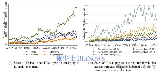 来自耶鲁大学和NBER的研究者并未局限于民意调查,而是深入分析了2020年3月至2025年4月期间,全美国所有电动汽车和混合动力汽车的“县级月度新车登记数据”。