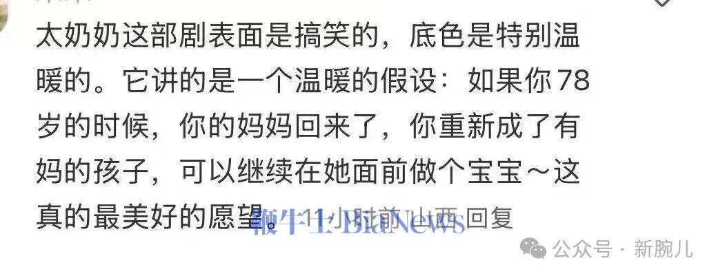 很多观众们看完剧后留言表示,“这部剧表面是搞笑的,底色是特别温暖的。它讲的是一个温暖的假设:如果你78岁时,你的妈妈回来了,你重新成了有妈的孩子,可以继续在她面前做个宝宝……”