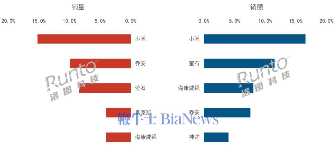根据洛图科技(RUNTO)线上数据显示,2025年第三季度,在线上全渠道市场中,小米、萤石、海康威视、乔安与神眸位列销额前五位,合计的市场份额达到47.8%。