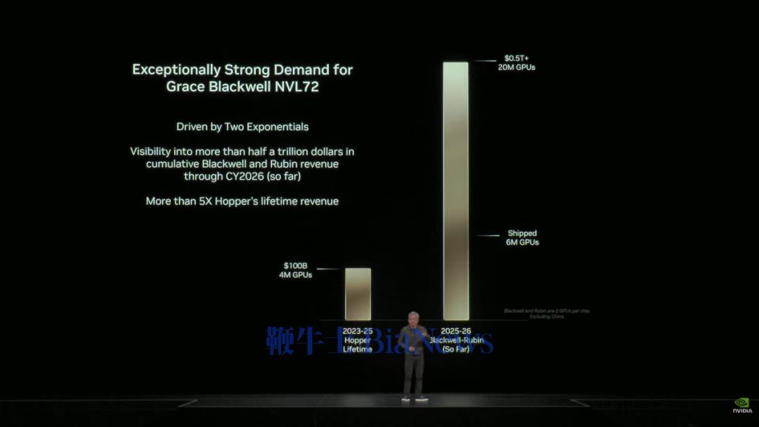 我认为,在Blackwell以及Rubin早期增长态势上,2026年我们很可能是历史上首家能够看到5000亿美元业务规模的公司。正如你所知,2025 年尚未结束,2026 年也尚未开始。这就是账面上的业务量,迄今为止已达半万亿美元。